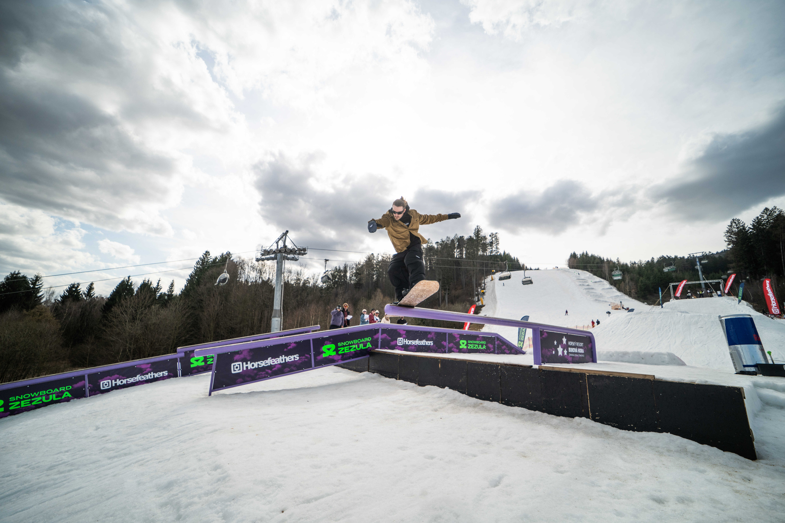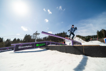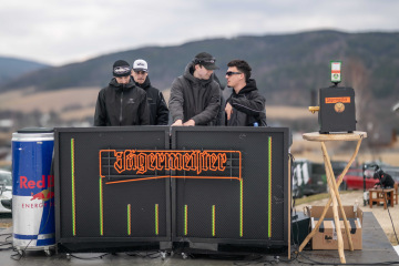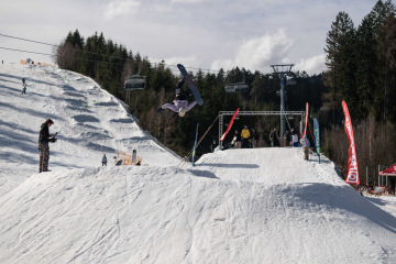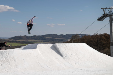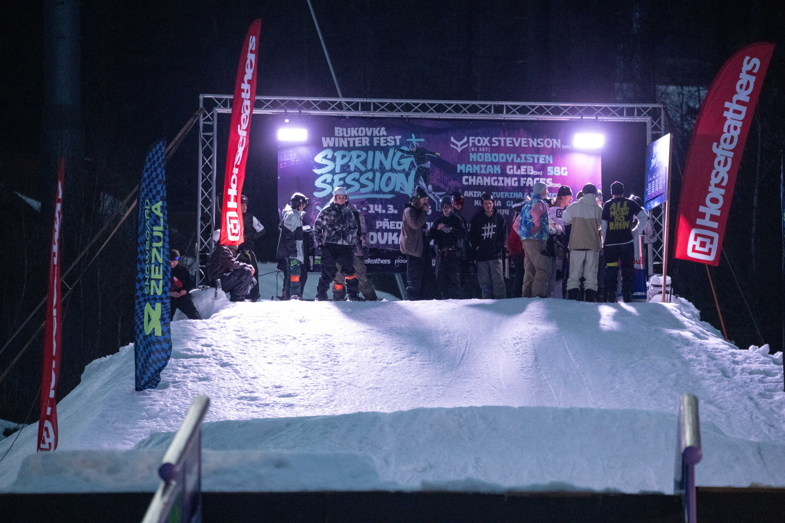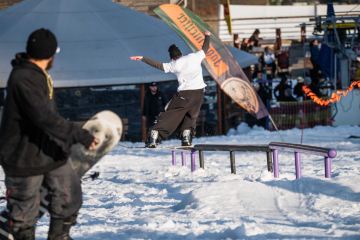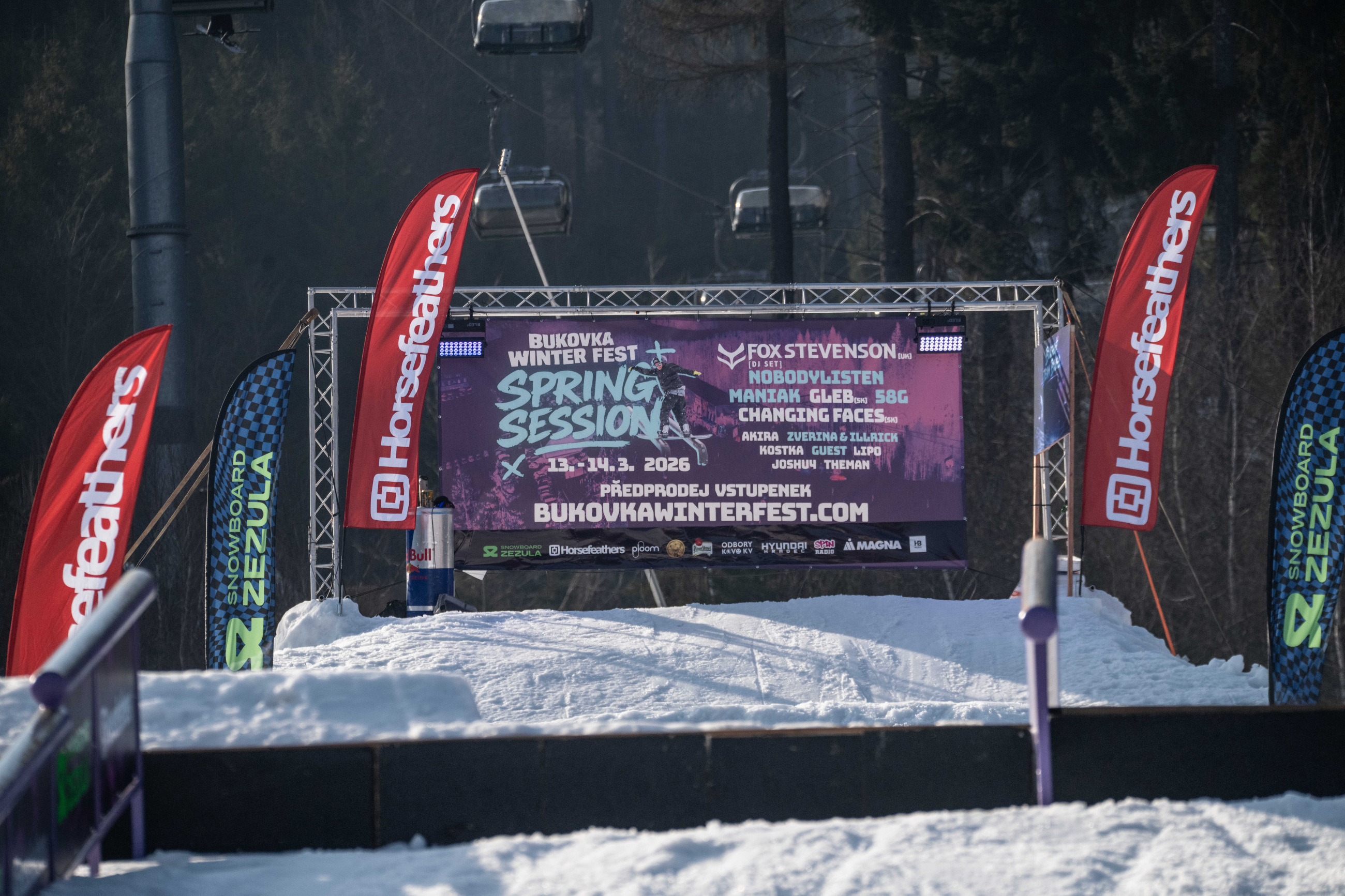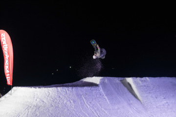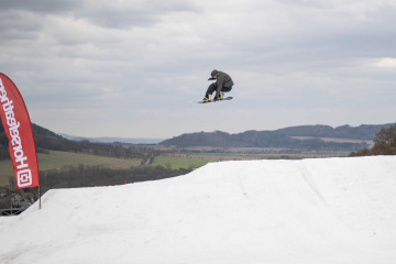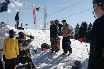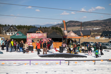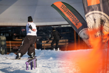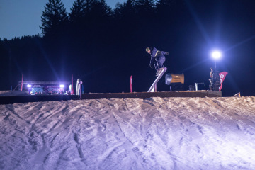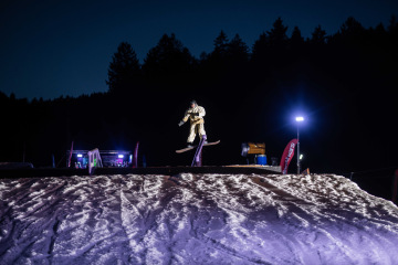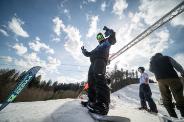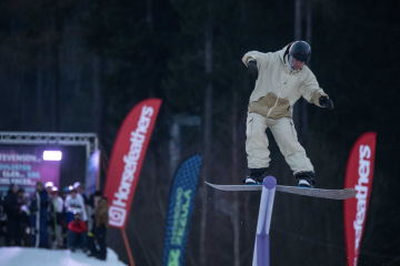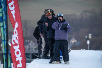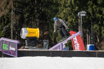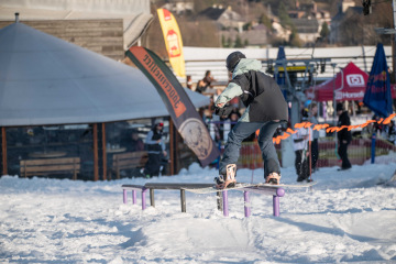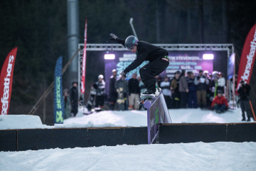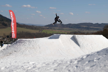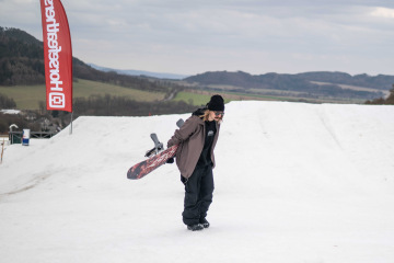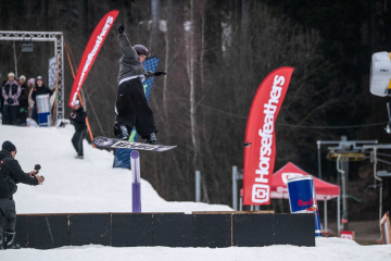 Na kopci totiž každý rok vyroste obrovská platforma z velkého množství sněhu s výraznými překážkami. Letos set-up vypadal jako z jiného vesmíru – rozjezdová rampa, uprostřed velký „vulkán“, který se dal jezdit jako skok, a dole před zraky diváků velká jibbová platforma se třemi překážkami.