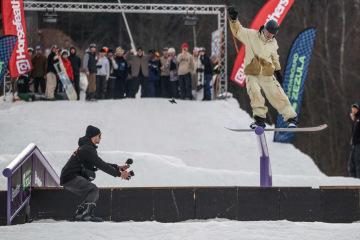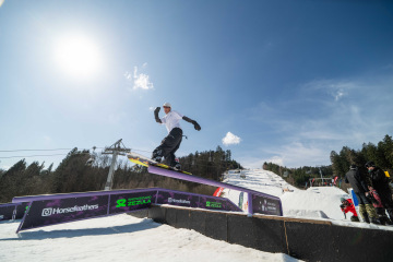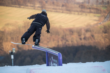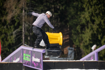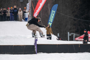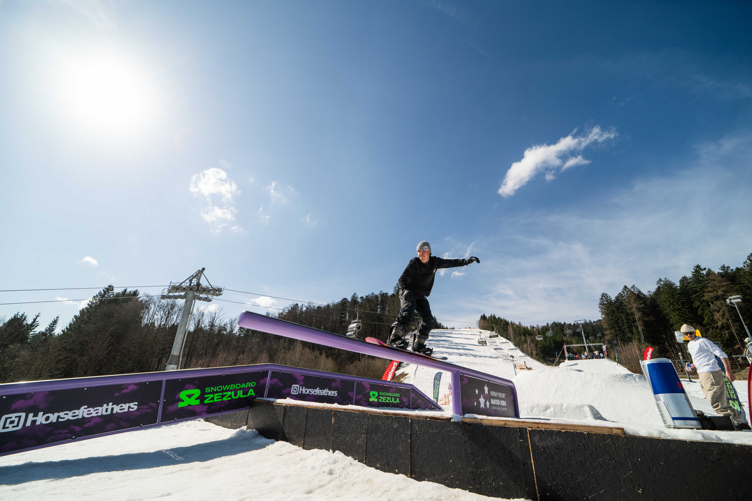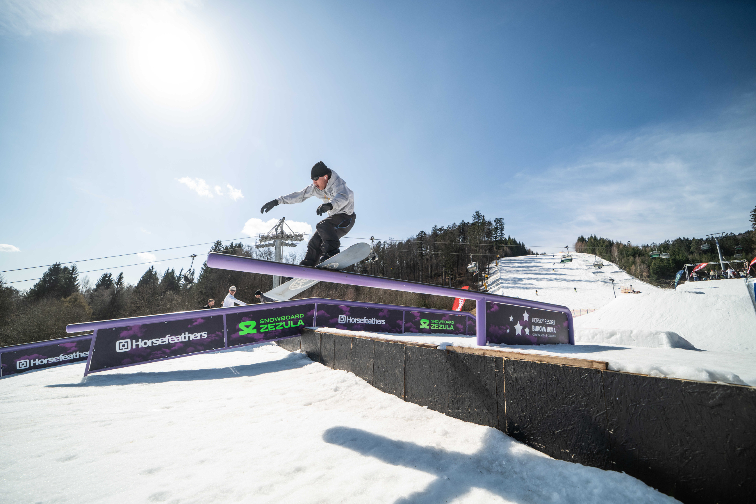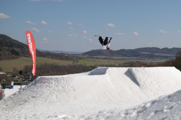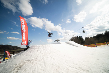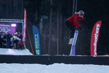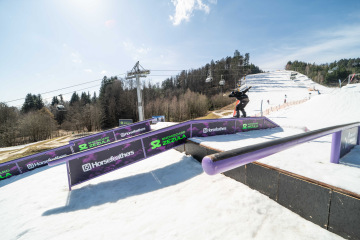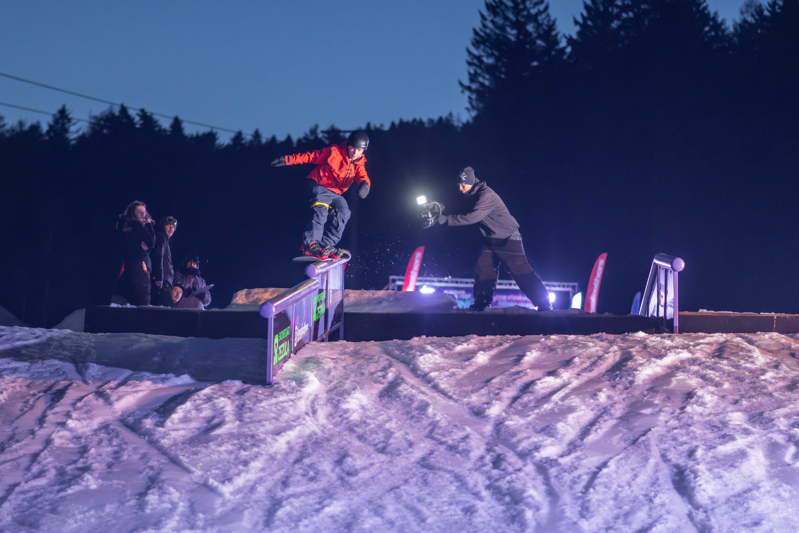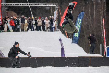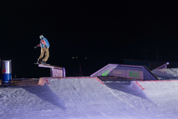 Na kopci totiž každý rok vyroste obrovská platforma z velkého množství sněhu s výraznými překážkami. Letos set-up vypadal jako z jiného vesmíru – rozjezdová rampa, uprostřed velký „vulkán“, který se dal jezdit jako skok, a dole před zraky diváků velká jibbová platforma se třemi překážkami.