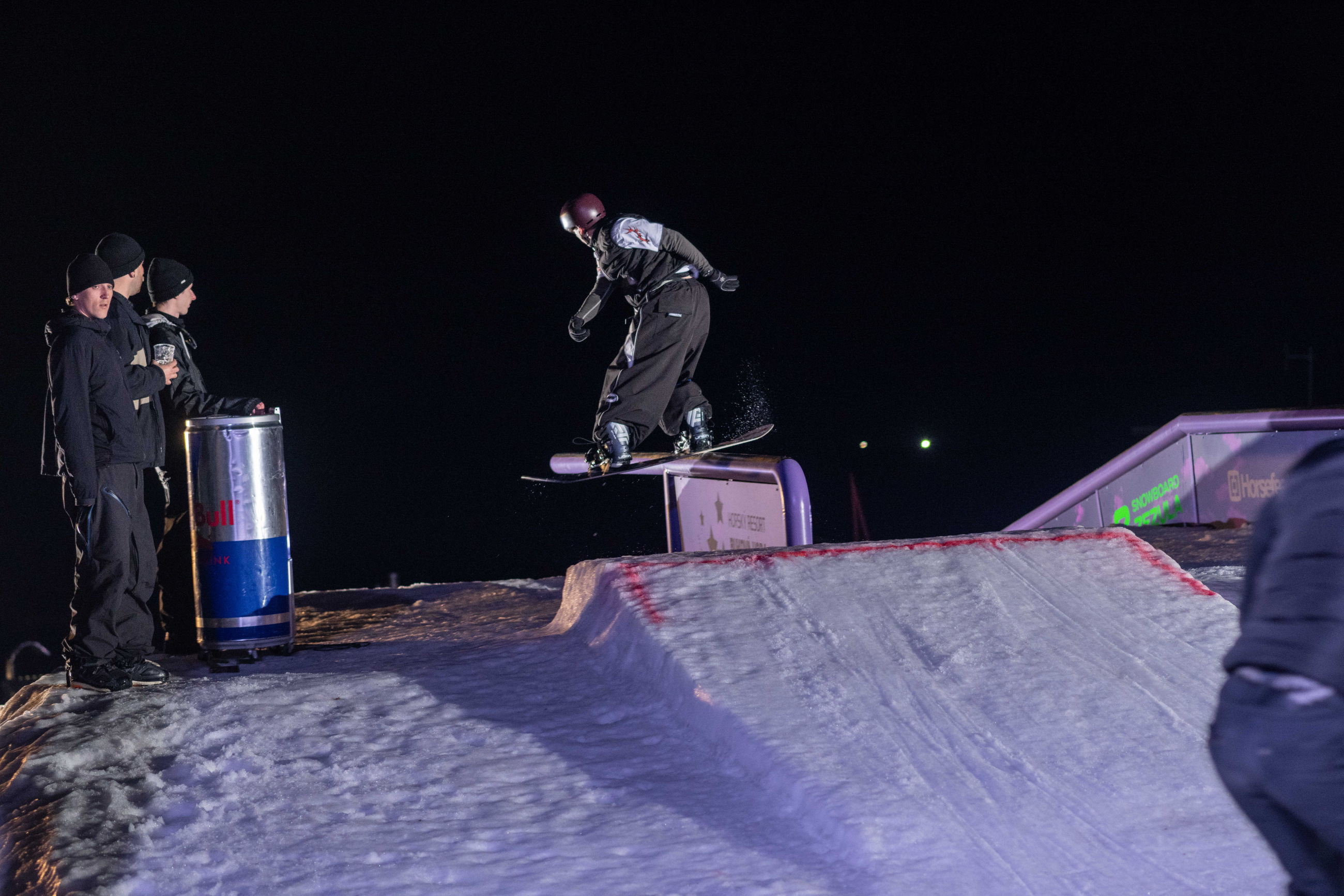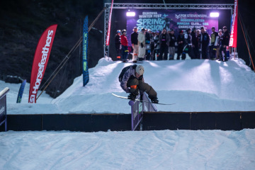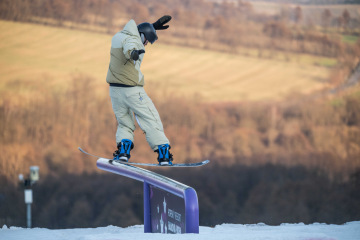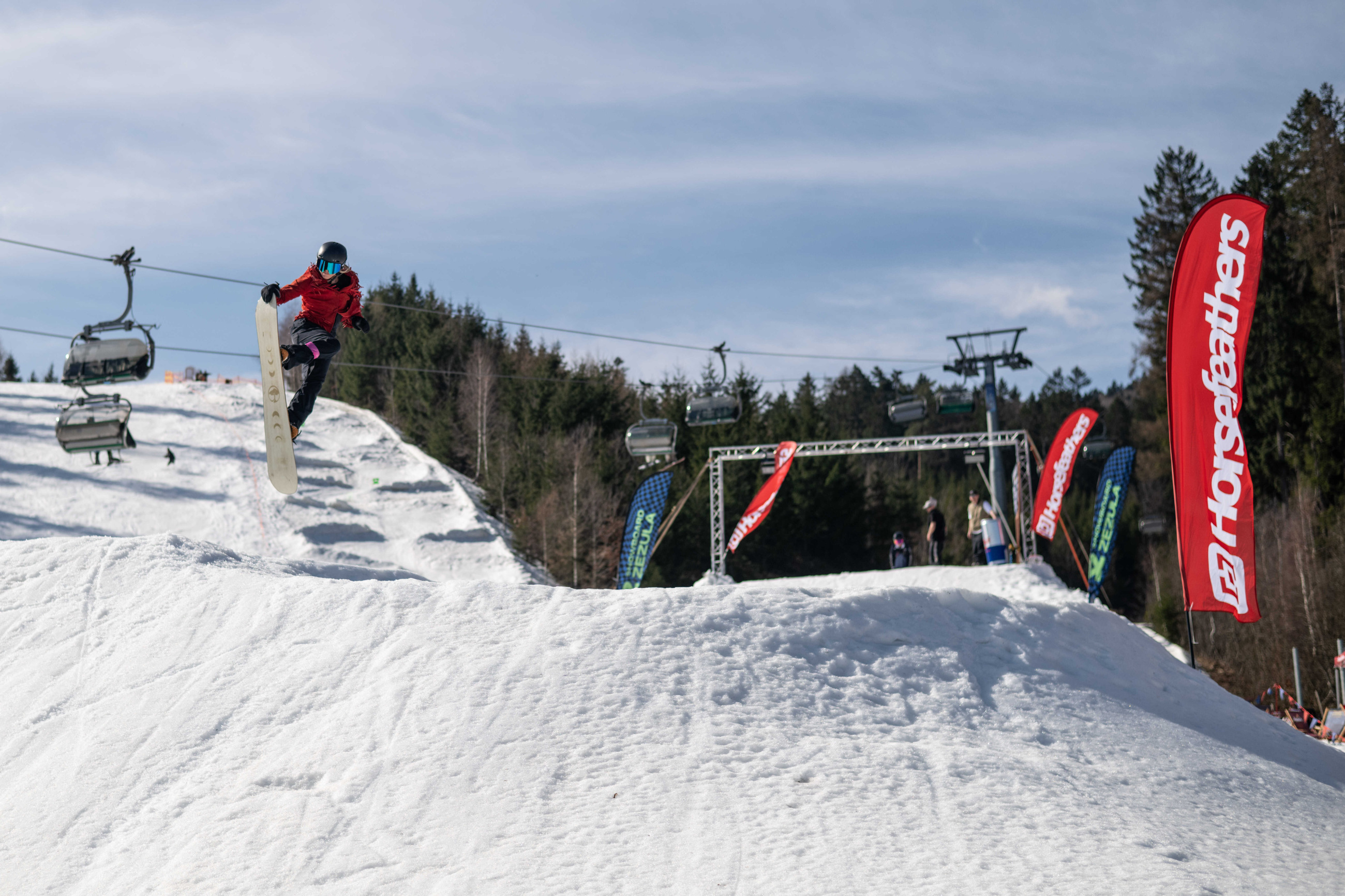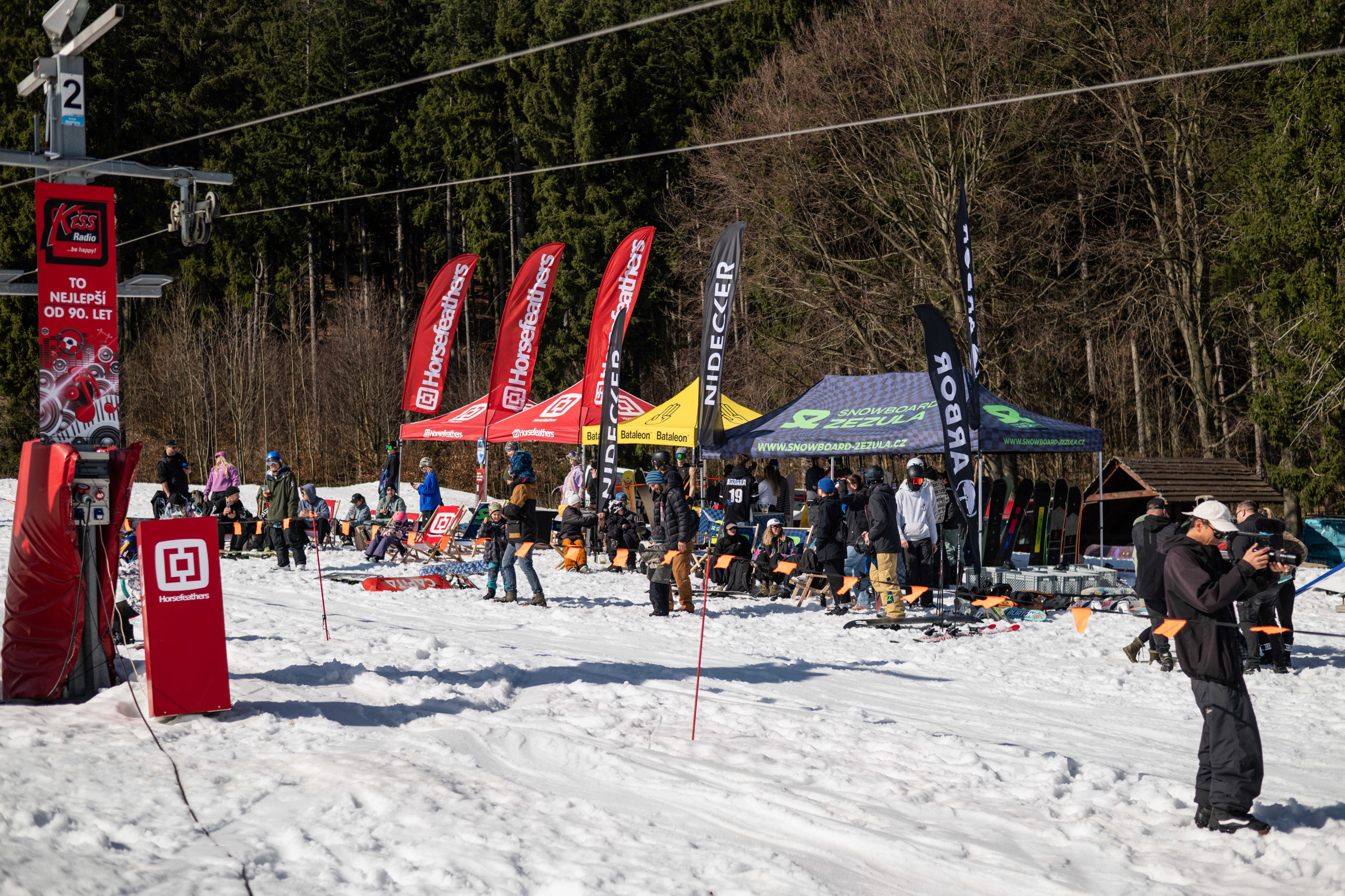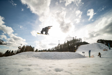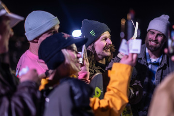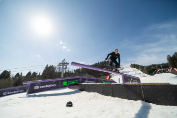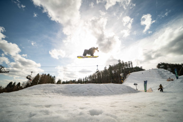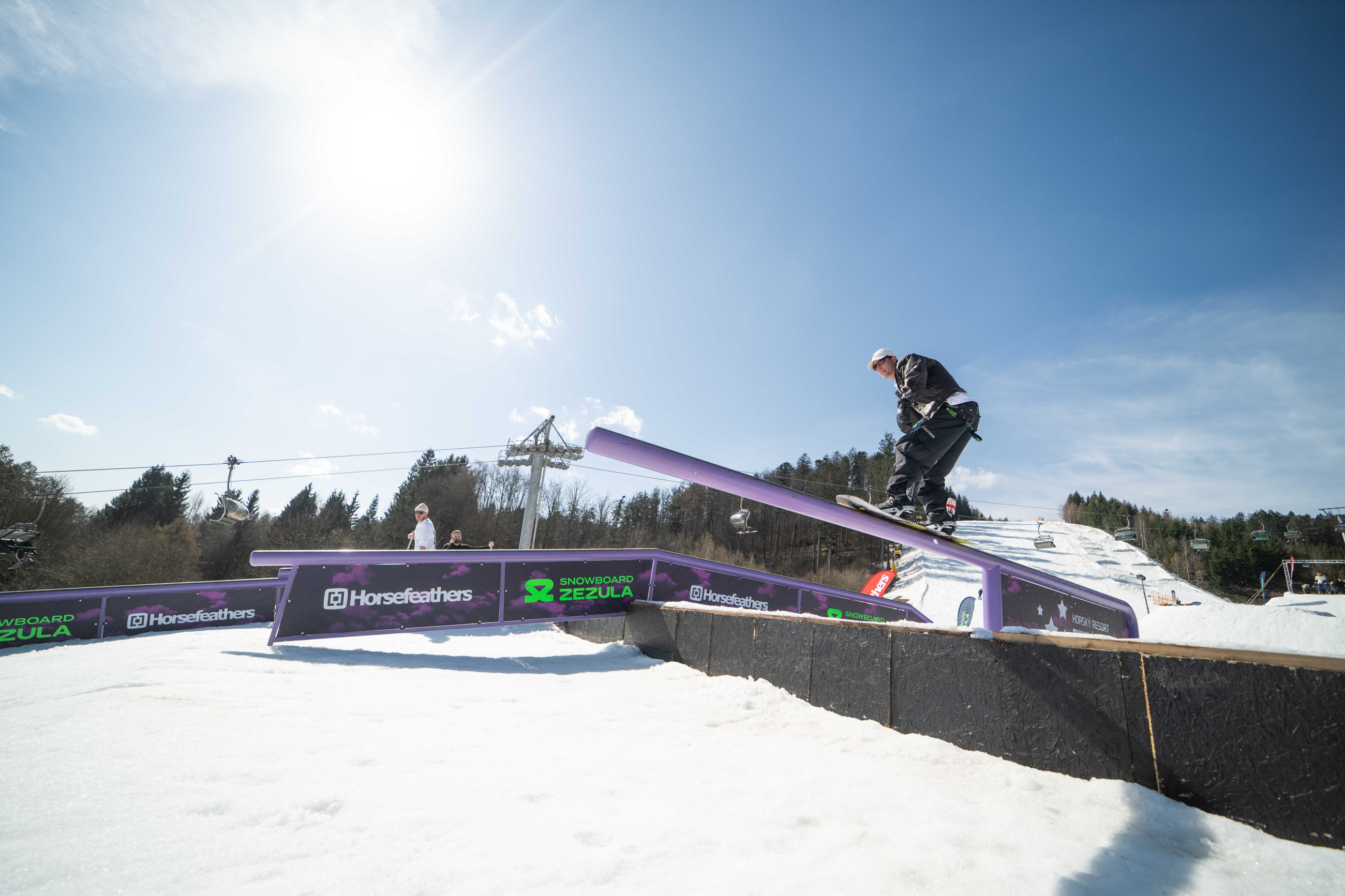 Na kopci totiž každý rok vyroste obrovská platforma z velkého množství sněhu s výraznými překážkami. Letos set-up vypadal jako z jiného vesmíru – rozjezdová rampa, uprostřed velký „vulkán“, který se dal jezdit jako skok, a dole před zraky diváků velká jibbová platforma se třemi překážkami.