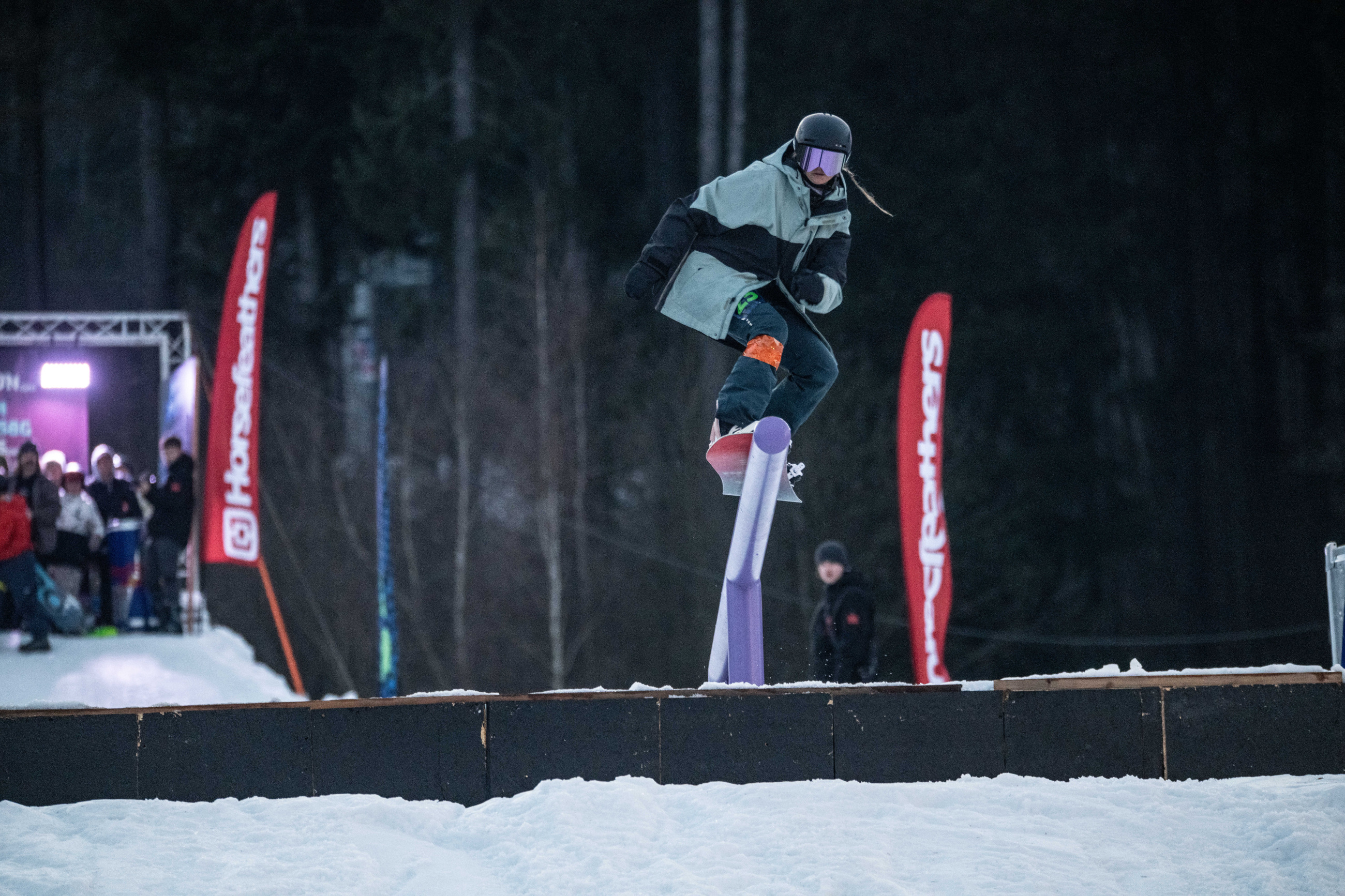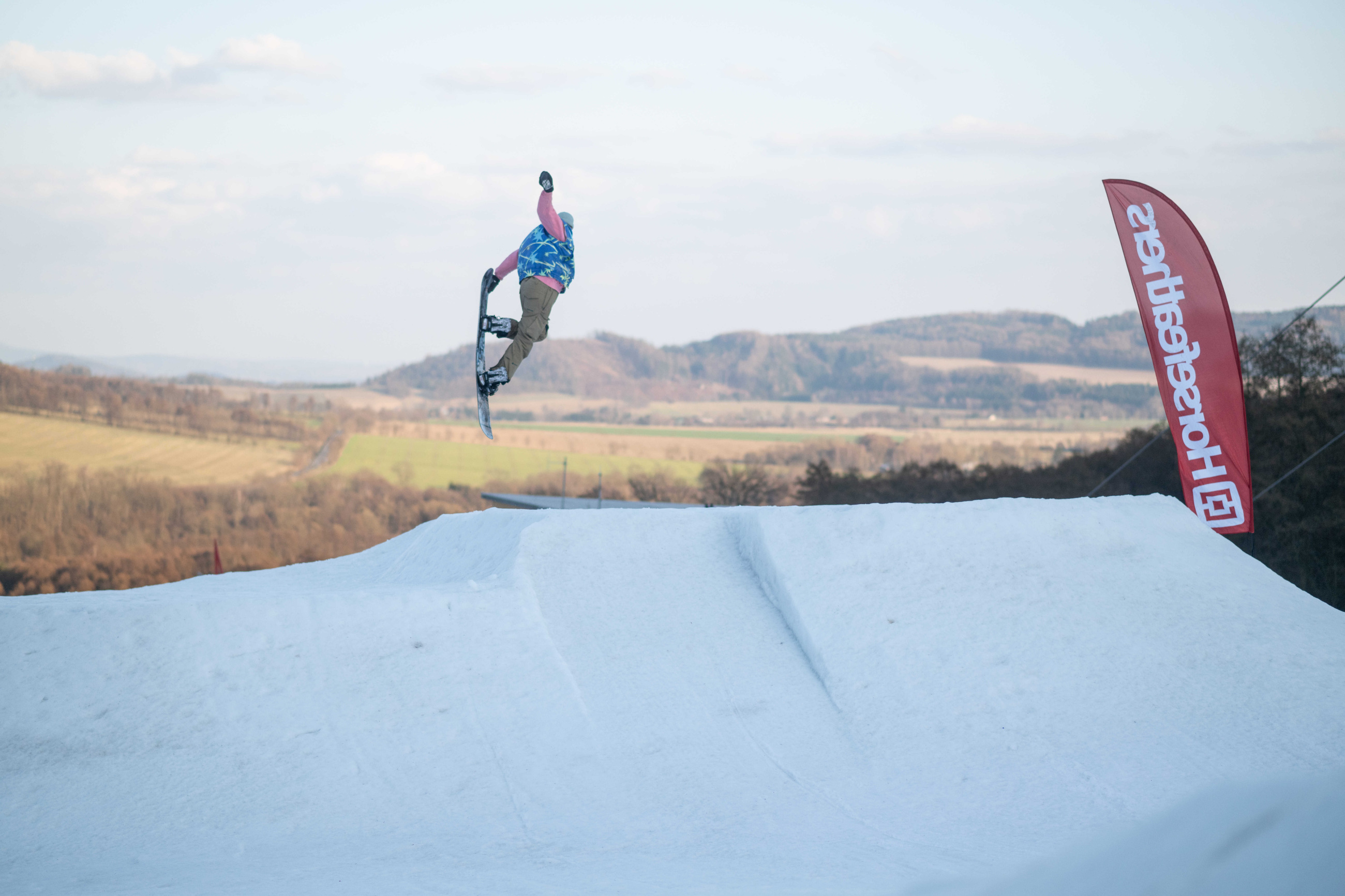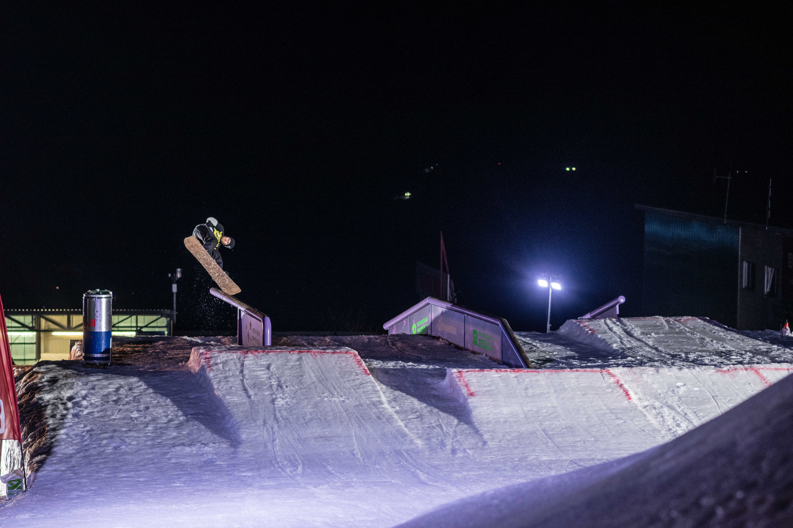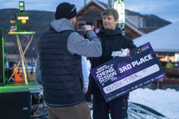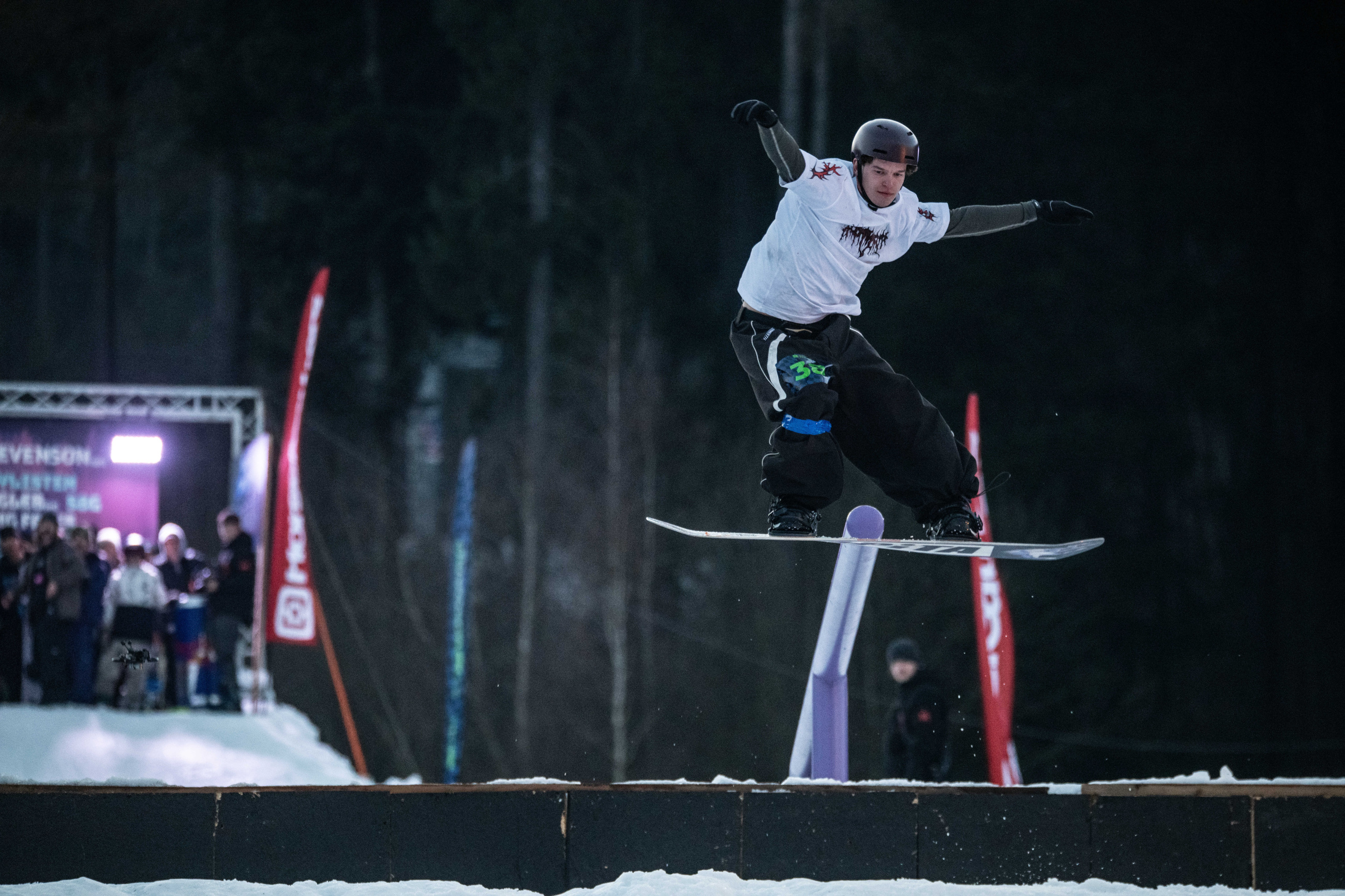 Na kopci totiž každý rok vyroste obrovská platforma z velkého množství sněhu s výraznými překážkami. Letos set-up vypadal jako z jiného vesmíru – rozjezdová rampa, uprostřed velký „vulkán“, který se dal jezdit jako skok, a dole před zraky diváků velká jibbová platforma se třemi překážkami.