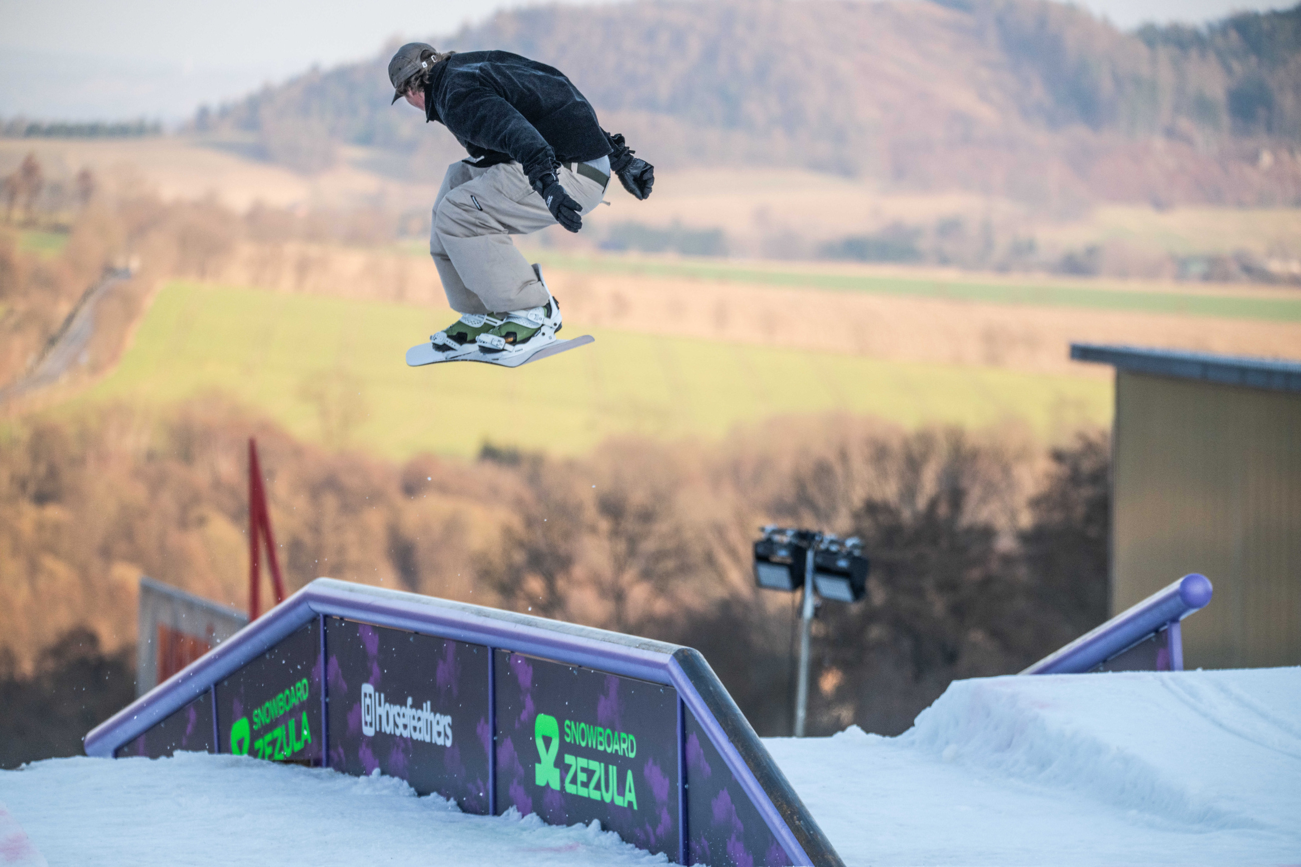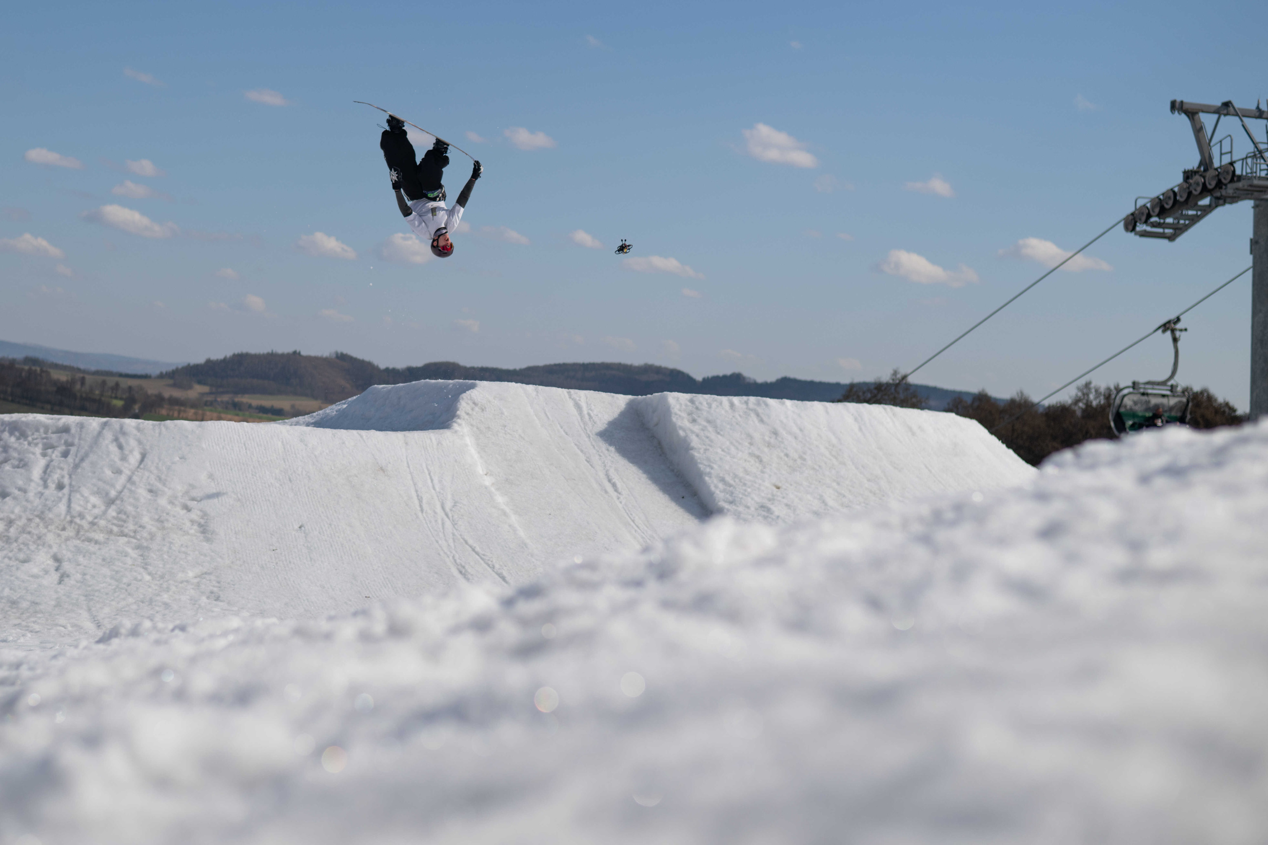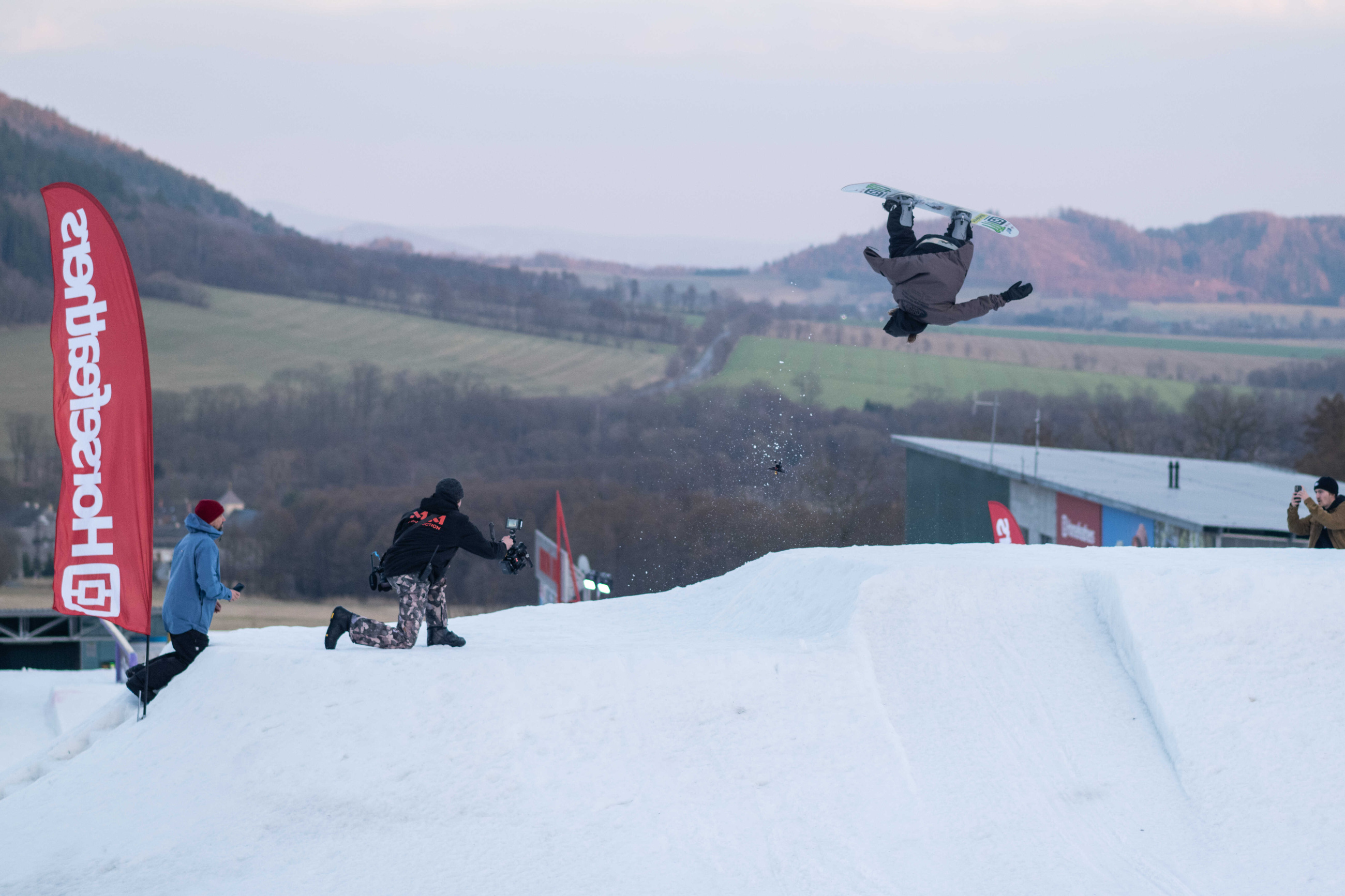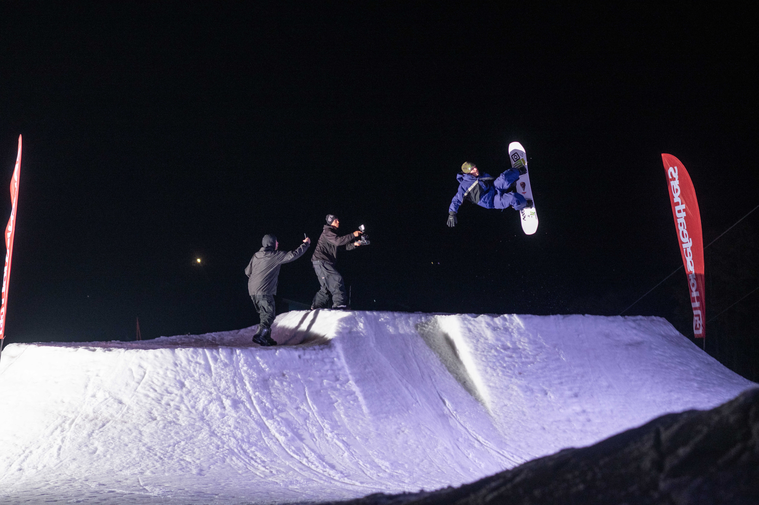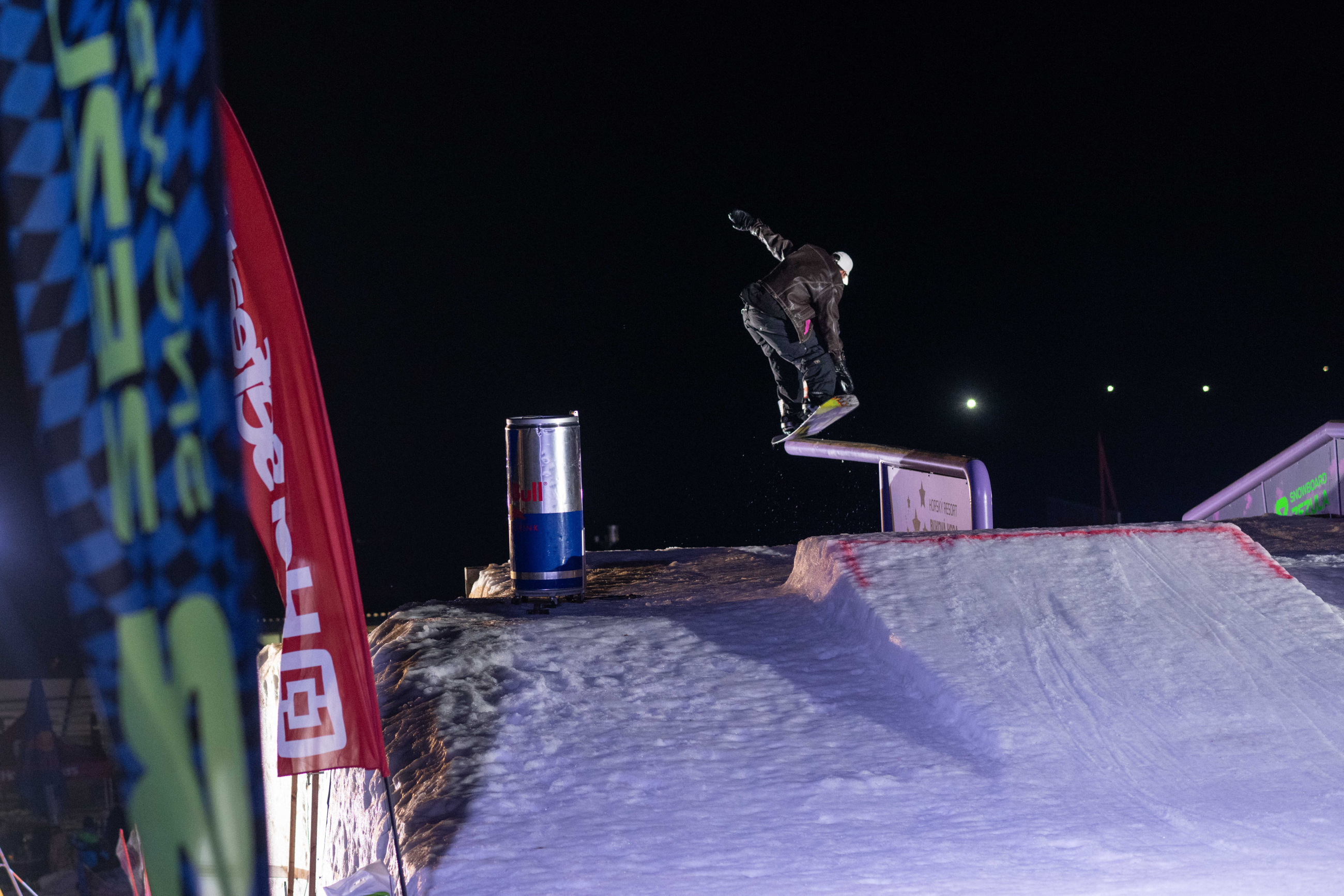 Na kopci totiž každý rok vyroste obrovská platforma z velkého množství sněhu s výraznými překážkami. Letos set-up vypadal jako z jiného vesmíru – rozjezdová rampa, uprostřed velký „vulkán“, který se dal jezdit jako skok, a dole před zraky diváků velká jibbová platforma se třemi překážkami.