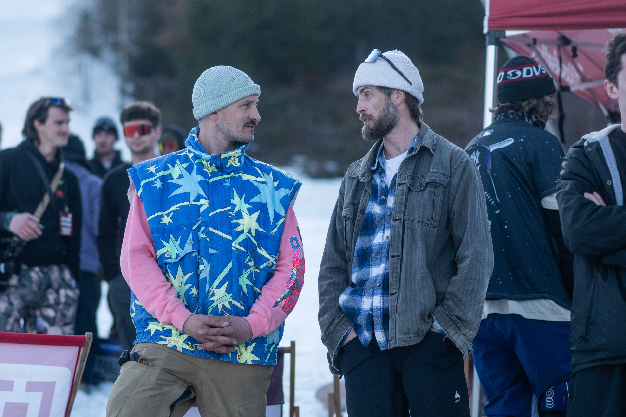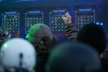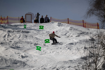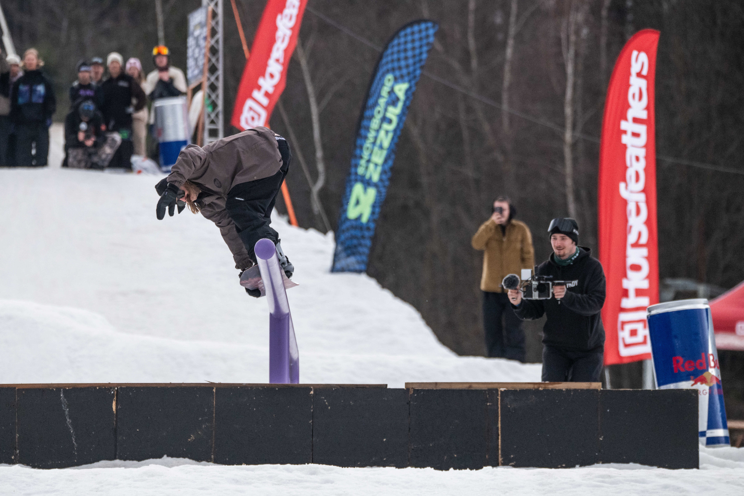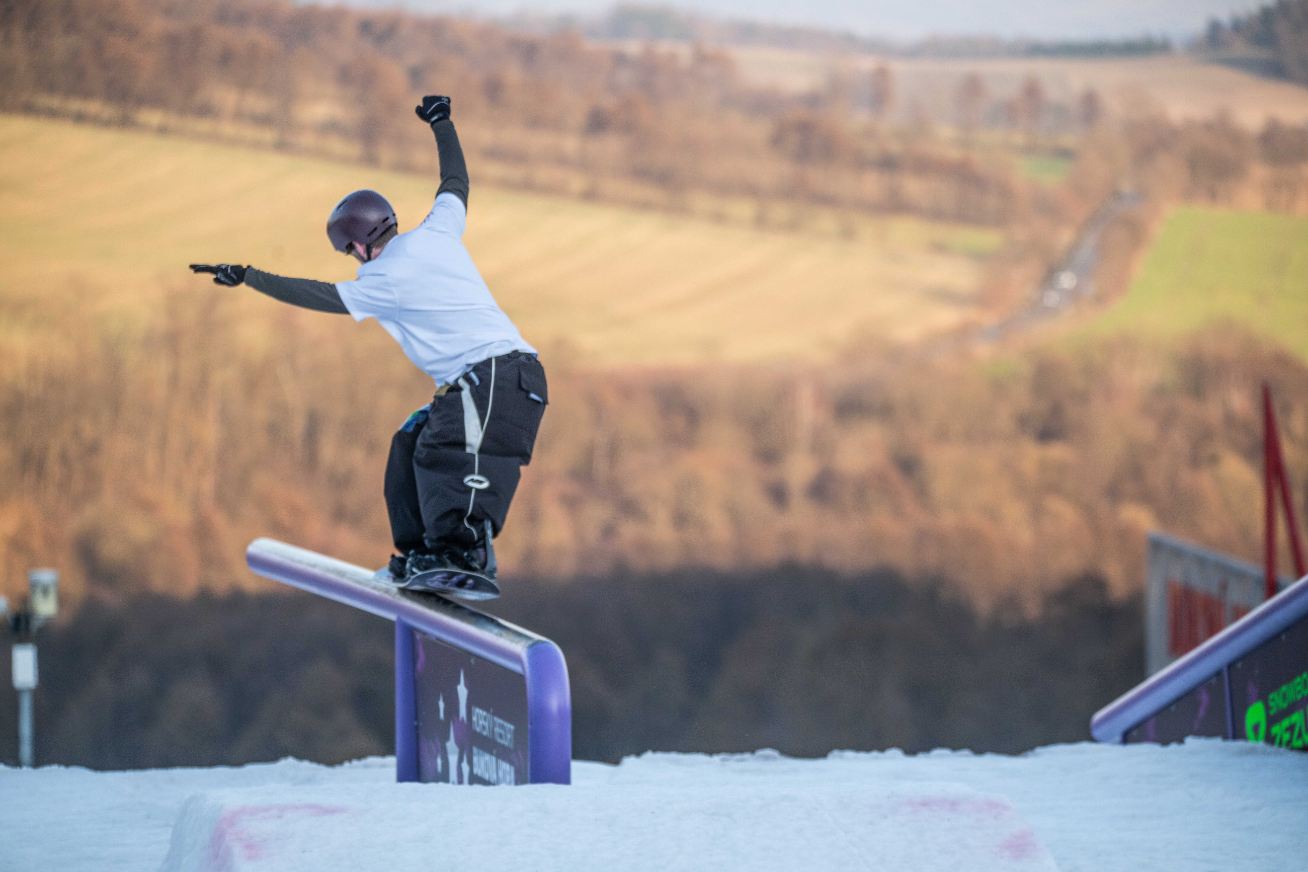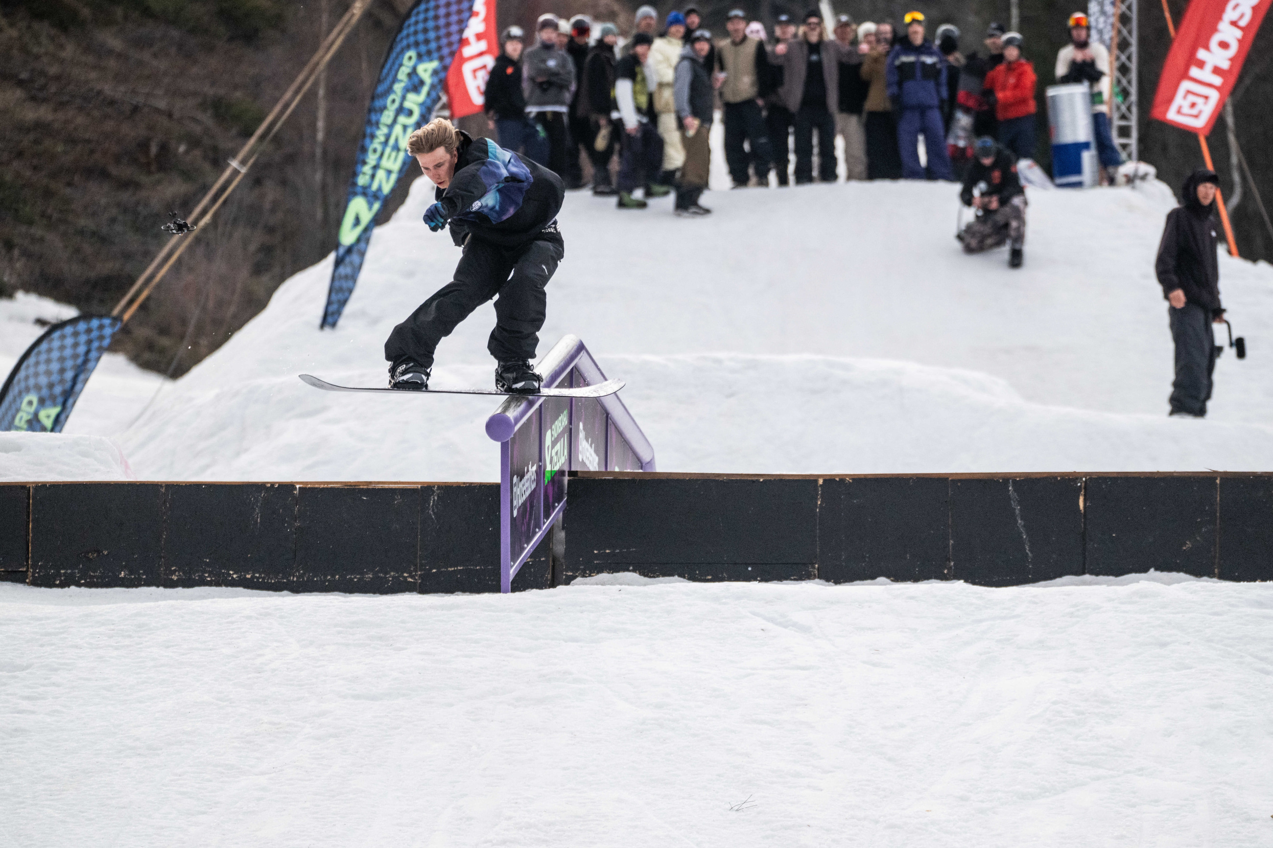 Na kopci totiž každý rok vyroste obrovská platforma z velkého množství sněhu s výraznými překážkami. Letos set-up vypadal jako z jiného vesmíru – rozjezdová rampa, uprostřed velký „vulkán“, který se dal jezdit jako skok, a dole před zraky diváků velká jibbová platforma se třemi překážkami.