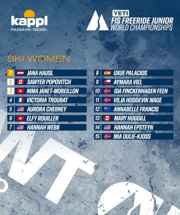 Mezi něžným pohlavím se do křížku s místním kopcem pustilo celkem patnáct chrabrých děvčat. Znalost domácího terénu nakonec přetavila v cenný vítězství Jana Hausl, která se neštítila ani trikových prvků a dokázala zkrotit dvě 360. V konečným součtu dva bodíky na zlatou ztratila její kanadská soupeřka Sawyer Popovitch. Bronzová Nima Janet-Moreillon hájící barvy Švýcarska už nabrala větší bodový manko, ale pořád jí to nezabránilo, aby vystoupala na stupně vítězů. Bramborová Victoria Troubat z Francie a pátá Aurora Cherney z USA už bohužel museli medailový ceremoniál oželet.