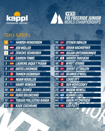 Mezi šestadvaceti pánskými talenty nakonec zač je toho loket všem ukázal osmnáctiletej výrostek z Novýho Zélandu jménem Hamish Henderson. Do svý lajny zakomponoval menší 360, cork 720 a závěrečnej big cliff drop a výsledná známka 88.67 bodu mu zajistila status šampióna! Na ocet nepřišlo ani domácí Rakousko. Jem Müller totiž volil podobnou skladbu triků jako vítěznej protinožec a domácím barvám zajistil stříbro. Radovaly se i Spojený Státy Americký zásluhou Zebedee Schreibera. Sedmnáctiletej capart z Palisades Tahoe vymlasknul dva pěkný 360 dropy a bronzová medaile ho neminula. Do nejlepší pětky se pak ještě vešel Kanaďan Carden Tomic a pyrenejskej jinoch Lurens Jaquet Pijuan ze Španělska.