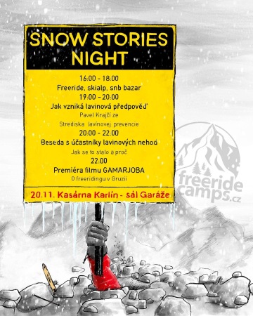 Chci vás pozvat do Kasárny Karlín 20.11. v pondělí na takovou kombo akci, kterou jsme pojmenovali SNOW STORIES NIGHT. Zima se totiž blíží nebo už je vlastně za rohem. Na prašan se asi všichni těšíme, někteří možná bojíme, tak proč to pořádně neprobrat.