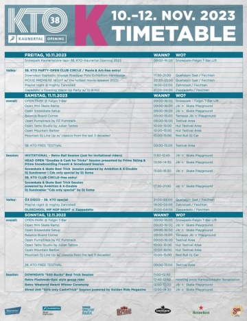 Už vám přetékají stavidla? Pořád to ale není všechno! Chybět nemůže víkendový Free Testival, kde více jak třicet renomovaných výrobce bude proklamovat svoje nejnovější vybavení! Ve výčtu aktivit pak nemůžeme zamíst pod koberec ani Tattoo Station, Mountan Barber, PZ Pumptrack nebo Balance Board Corner či snowboardové muzeum. Žně si pak užijí i vymetači večírků! V rámci Club Circle můžete popustit ventilek duši během dvou nocí hned ve třech klubech. Největší fláky osmdesátých a devadesátých let rozpohybují vaše boky během sobotní noci v rámci diskotéky Ö3, která ochromí pártyplac Quellalpin Saal! Živo bude ale i v barech Zahnstadl nebo Zappadello. Nesmíme pak zapomenout na páteční vernisáž fotek z akce Gapstatic Voyage Roadgap, kde se lítalo přes místní známou silnici, na kterou naváže Premiere Movie Night plná nadupanejch filmů a videí! Uff! No, jestli se dá tohle všechno napěchovat do tří dnu, tak potěš! Každopádně berte to jako horký tip na nadcházející víkend!