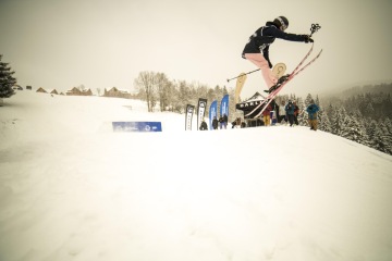 První víkendový den patřil slopestylu a místní shapers si pro nás nachystali pěknou trať, kde jezdci mohli spustit adrenalinovej rej. Vyřádit jste se mohli na dvou jibových platformách s celkem pěti překážkami a skokanské choutky jste pak ukojili na dvou po sobě jdoucích kickerech. Do mužské kvalifikace si nakonec našlo cestu dvacet čtyři borců a plná půlka po dvou kvalifikačních kolech už mohla jen lelkovat. Dvanáctka nejlepších si totiž vydřela postup. Dívčí startovka tentokrát rozhodně ve švech nepraskala. Vzhledem k tomu, že k oprávněnému startu potřebujete FIS kód a rok narození 2009 a starší, tak chyběly známe firmy jako ségry Nečasovic nebo Adélka Krčálová. Dámy si ještě nějaký ten rok musí nechat zajít chuť. Vše se tak smrsklo na souboj Agáta Christophová vs. Gábina Janoušková a lepší trikovou koláž nakonec v parku vykreslila Agáta, která tak zajela zkušenou harcovnici z Harrachova.