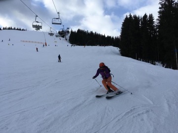 Jak ze blížil čas oběda, zatoužili jsme po modrých sjezdovkách, kde bychom díky mírnějšímu sklonu mohli pilovat carvingové oblouky a naši techniku. I těch má středisko dostatek, ale jsou umístěné spíše kolem Areitbahn. Nejvíce nás zaujala sjezdovka č. 2 Hirschkogelpiste. Ve spodní části se rozdělovala a bylo možné si vybrat z červené a modré varianty.