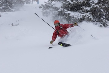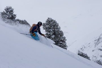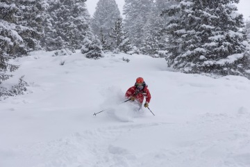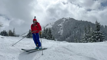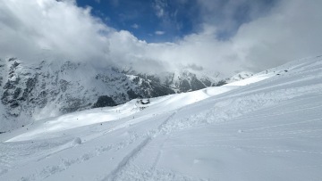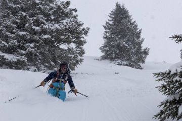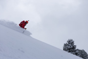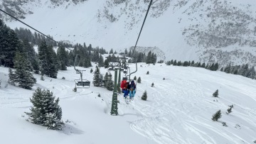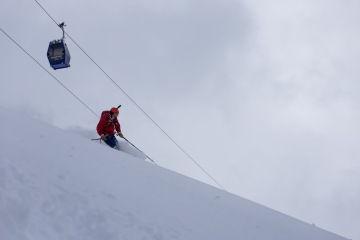 Sice není vidět na špičky lyží, ale v prašanu se skoro topíme, takže dáváme jednu jízdu za druhou. Obleva na začátku dubna už ovšem odkryla některé skalky, které se teď nebezpečně schovávají pod novým sněhem a občas se rozhodnou zanechat nám vzpomínku na skluznici. Pauza na burgr a kávičku v místní hospodě byla rychlá, protože se začala protrhávat obloha, Toho jsme museli využít. Středisko Ski Arlberg nabízí kromě klasických sjezdovek i spoustu freeride lajn, takže i odpoledne je zde pořád z čeho vybírat.