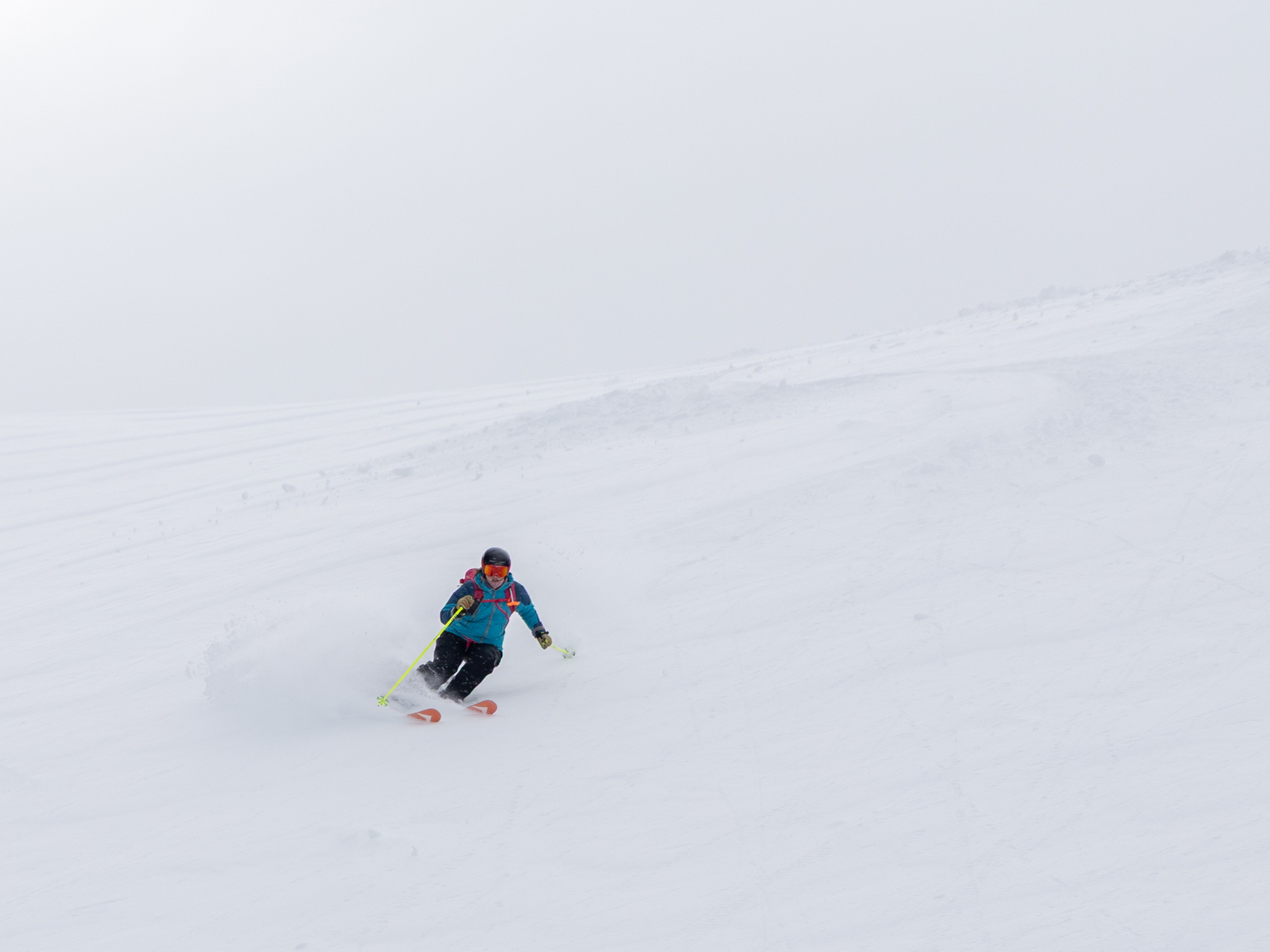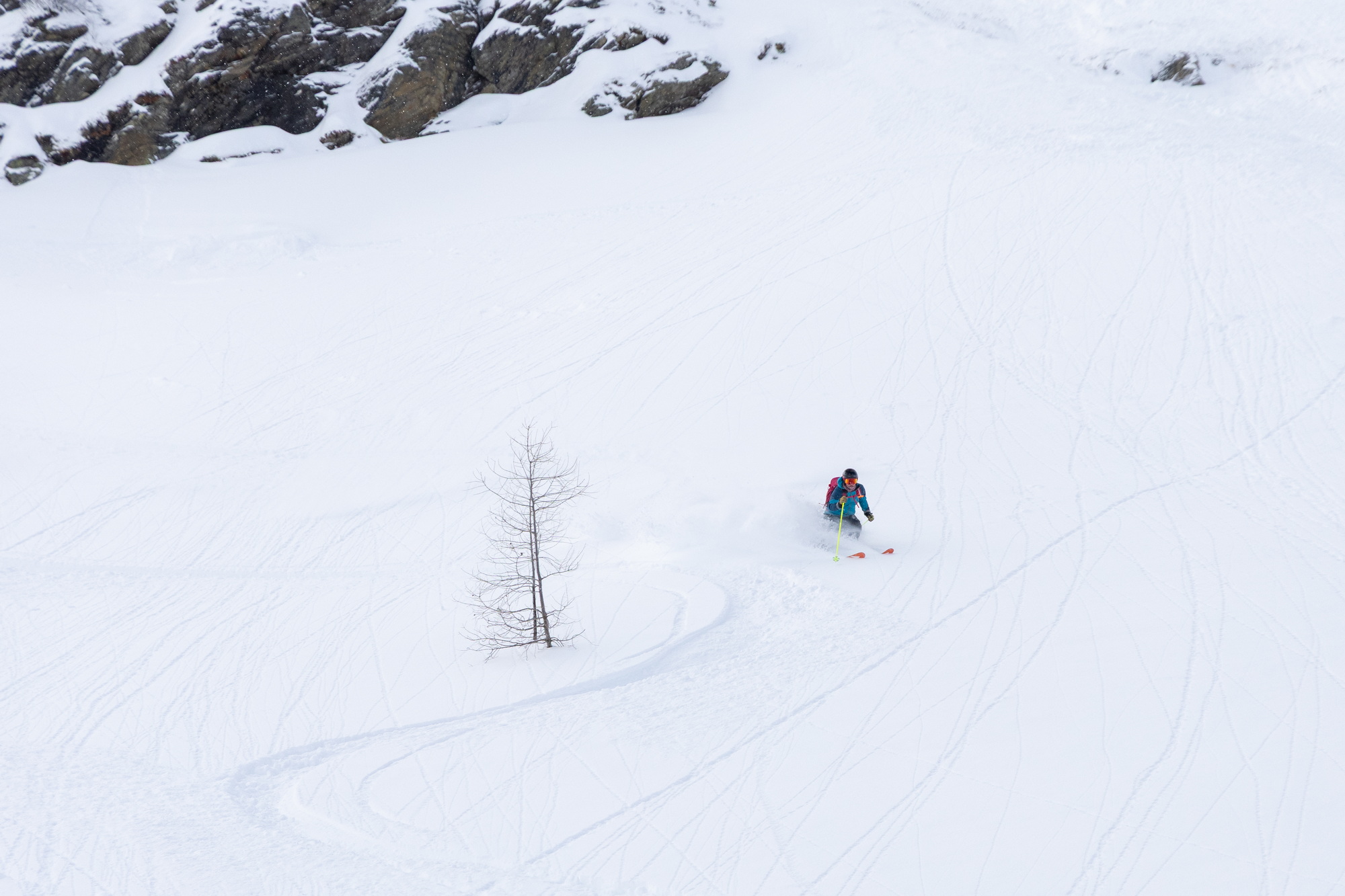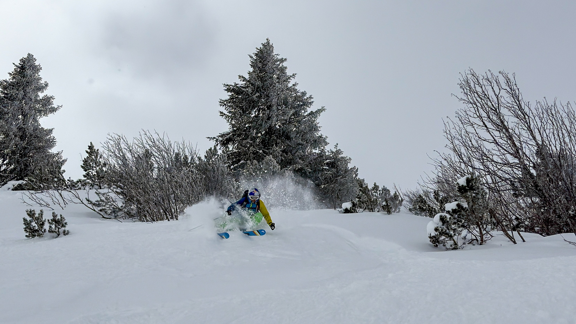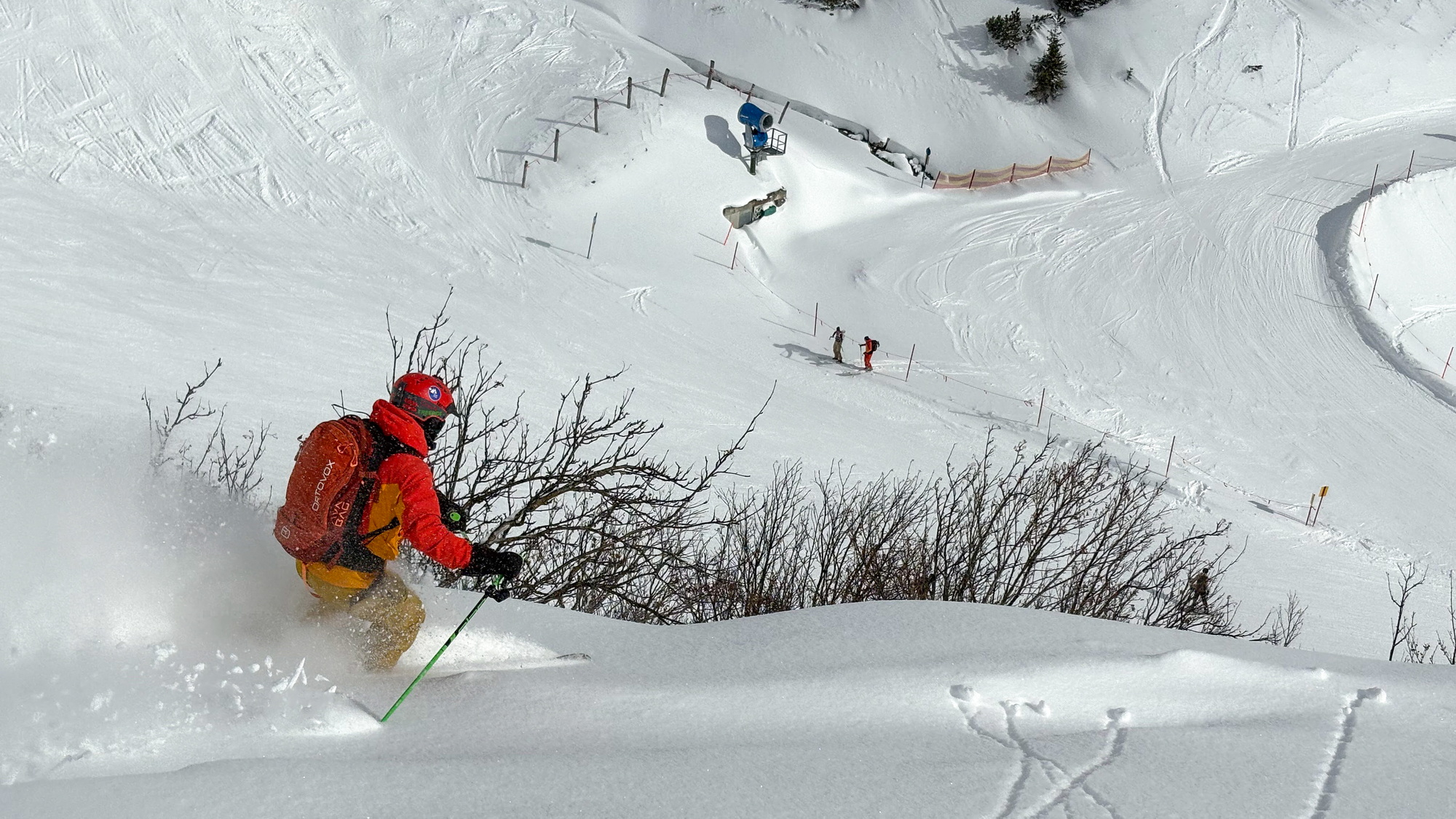 Překvapivě opět přichází mlha a my se tak rychle přesouváme na Rendl, kde podle webkamer svítí sluníčko. Z minulého dne jsme poučeni, a tak rovnou vylučujeme jihozápadně orientované svahy, kde vyčnívá spousta kamenů. Jako první jízdu volíme Gampberg a z něho severovýchodní svah. Z horní stanice Gampberg Direkte si musíme ještě vyšlapat kousek s lyžemi na ramenou, abychom přelezli přes hřebínek a mohli se vrhnout dolů k říčce Stockibach. Máme štěstí, před námi tu jely jen dva páry lyží. Prudší začátek se pomalu rovná a rozšiřuje a my malujeme naše první linky. Při dojezdu k potoku již narážíme na vyjetou dálnici od skialpinistů, a tak nemusíme ani píchnout hůlkou. Teď je před námi ještě poměrně svižný dojezd na cestu. Prudký, boulovatý svah plný porostu nás ale neudolá, a tak se po chvíli opět ocitáme na sjezdovce, kde nám hned padne do očí hospůdka Bifangalm.