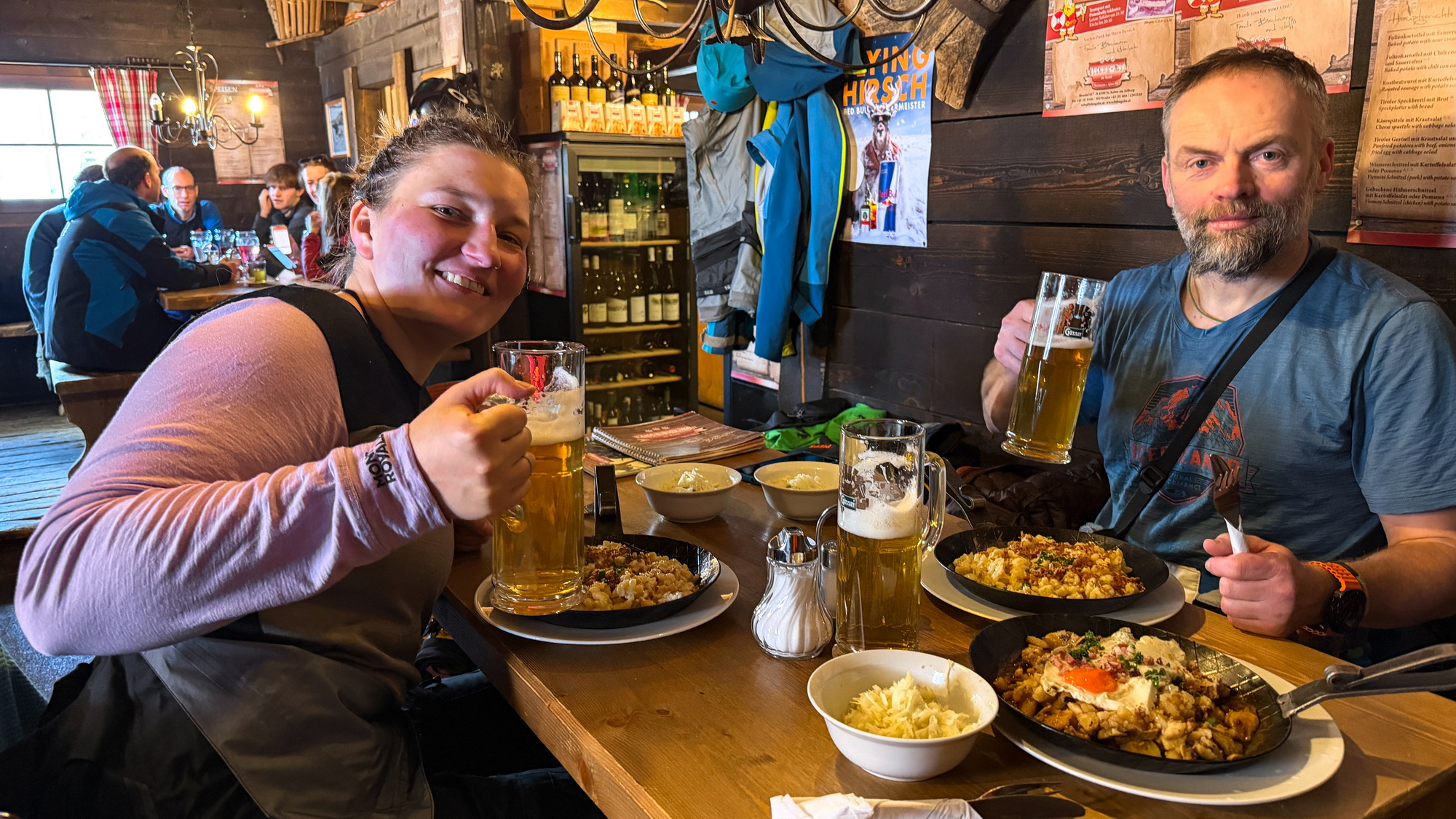 Počasí se opět kazí, a tak Ivoš zavelí a přejíždíme do Stubenu. Kdyby nebyla mlha, člověk by rozhodně ocenil červenou Valfagehrjoch a modrou Valfagehr, dlouhé a rovné sjezdovky ideální na široké carvingové oblouky. Vyjíždíme Albonabahn II a zjišťujeme, že mlha se nevzdává, a tak velíme ústup do restaurace Albona, kde si dáváme výborný Albona burger a jedno točené. Nemá smysl nikam spěchat. Po cestě zpátky ještě kluci nacházejí slušnou porci prašanu v lese na Eisfall Skiroute, kde je aspoň něco málo vidět. Strmý svah se spoustou sněhových polštářů je malá satisfakce na konec. Nic naplat, dnes nad námi tedy vyhrály hory a my se postupně stahujeme zpět do St. Antonu. Dnešní den bych nazvala jako „den tréninku předozadní rovnováhy“. Náhradní program je jasný, procházka centrem Arlbergu, apres-ski a bazén. V centru Arlbergu nás zaujme Cafe Schneider a jeho apres-ski nabídka. Po pár rundách vyrážíme do bazénu. WellCom má v nabídce jak bazén, tak i saunový svět. My si dnes vystačíme se základní variantou – bazén, vířivky a luxusní venkovní bazén s proudy, ze kterého se můžete pokochat horami, tedy pokud zrovna není mlha a nesněží.