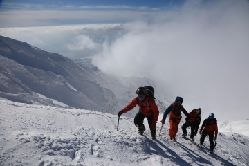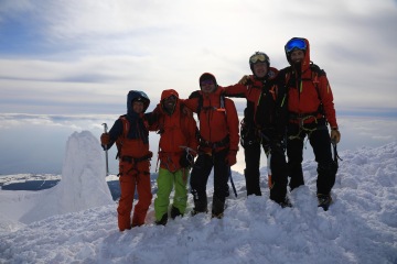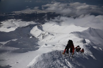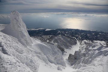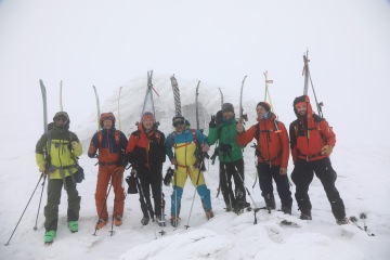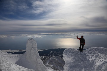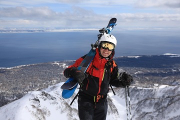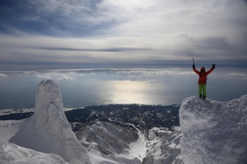 Ráno realizujeme snídani v dodávce a míříme k úpatí hory. Vrcholek je opět v mracích, ale Take vypadá optimističtěji než včera. Je si vědom naší motivace se na vrchol dostat a udělá něco, co je možné asi jenom v Japonsku. Na vrchol pošle z druhé strany asistenta Yusukeho a nakáže mu, ať si tam v mracích a ve větru udělá záhrab a čeká, až mraky zmizí. Japonská oddanost je pro nás v tu chvíli nepochopitelná, ale jsme za ní sakra vděční. My zatím postupujeme na pásech severní expozicí. Ve 1200 metrech je třeba nasadit mačky a překonat poměrně prudký svah. Všichni se docela boříme a náš pohyb připomíná spíš vertikální plazení se prašanem. Tato aktivita odrovná dva ještě trochu nemocné parťáky, kteří chtěli pokus o vrchol zkusit i přes rýmičku. Nešlo to a vracejí se s dalším asistentem dolů. Summit team dorazí na refuge, kde se zabydlíme a čekáme na Yusukeho povel. Zatímco my jsme chráněni před větrem a sněhem, Yusuke někde v záhrabu čeká s vysílačkou v ruce. Po hodině čekání přichází povel a razíme na vrchol. Po nějaké době zakládáme ski depo, nasazujeme mačky, bereme cepíny a dál pokračujeme bez lyží. Nahoře nás má asi někdo hodně rád, protože veškeré mraky se rozplynou a my s otevřenou pusou koukáme na Japonsko na jedné straně, Rusko na druhé a oceán všude okolo. Dorazíme na vrchol a říkáme si, jestli v životě uvidíme ještě někdy něco krásnějšího.