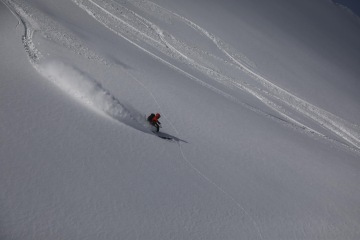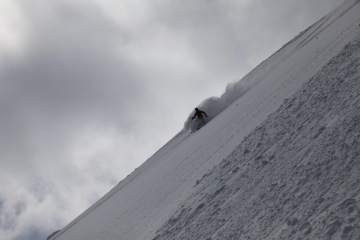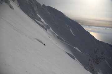 Po pár obligátních fotkách seběhneme zpět do ski depa a brousíme si zuby na nedaleký kuloár. Na ski-alpu mám rád, že den dosažením vrcholu zdaleka nekončí a to nejlepší máme vlastně ještě před sebou. Kuloár vypadá na pohled prudší než ve skutečnosti, jedná se tedy celkem o pohodovou jízdu dolů na sluníčku a s výhledem na moře. Guide Take opět koordinuje focení jak při epizodě Salomon Freeski TV.