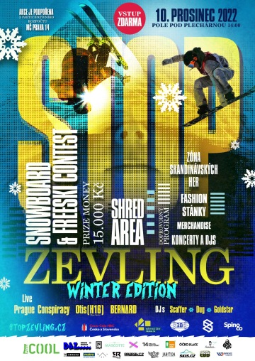 Jak to tak venku vypadá, tak paní Zima snad konečně sešlápla pedál plynu až na podlahu a sněhová pokrývka přibývá mílovými kroky. Ještě ale než se rozutečeme po všemožných snowparcích po naší krásný Republice, tak si to chce malinko protáhnout (né zlamat) kosti, rozjezdit se a trošku před sezónou pokecat. A o víkendu je k tomu ideální příležitost! Na pražském Čerňáku totiž tuto sobotu 10. prosince vyroste Shred Area se sněhem, která bude svědkem Stop Zevling Winter SNB a Freeski Contestu. Organizátoři loni bohužel doplatili na pelešivej covid a event se musel odpískat. Letos jim ale konečně nebude nic stát v cestě! O víkendu se tak doufejme všichni fandové freeskiingu a snowboardingu sejdou na samém okraji Prahy, aby si společně užili den napěchovaný kvalitní zábavou!