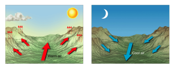 Podobný efekt může nastat i v horách a zde se mluví o termálním větru v údolích. Efekt je stejný. Jen zde se jedná o pomalejší ohřívání údolí než vrcholků hor. Typické místem je Lago di Garda v Itálii.