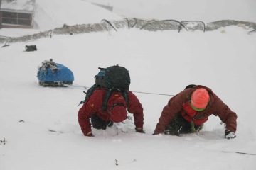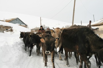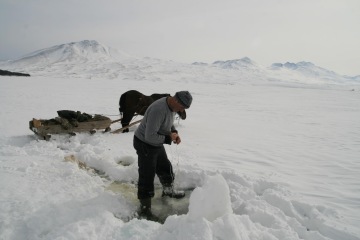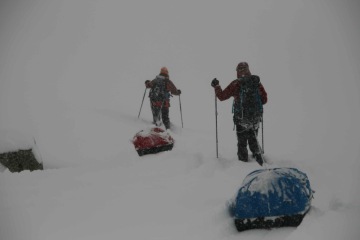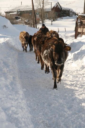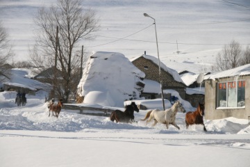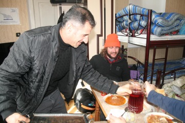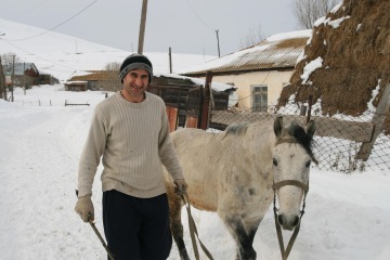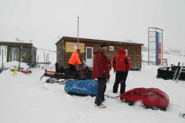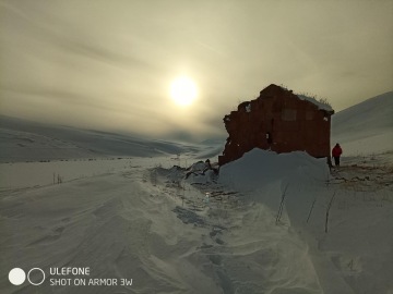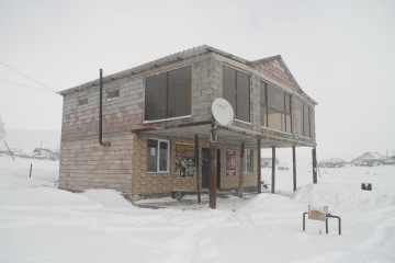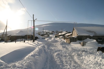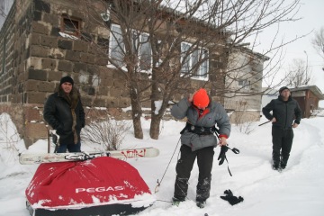 Místní cesta už byla prohrnutá buldozerem a tak jsme po ní vyrazili k našemu Guest housu. Po cestě nám začalo docházet, že plánovanou únikovou trasu nějakých 40 km neznámým terénem a v hlubokém sněhu nemáme šanci bez ideálního větru a možnosti zapřáhnout kity zvládnout. Jenže v tom nás autem dojel místní řidič maršrutky (dodávky sloužící tu místo autobusů) a nabídl se, že nás odveze, že za 3 dny bude jediná cesta do vesnice protažená!