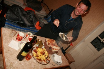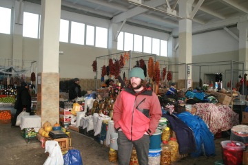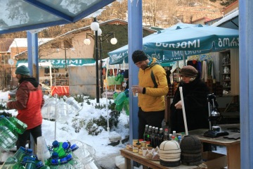 Po příletu do Kutaisi jsme na letišti na přivítanou nafasovali po flašce vína a pak už na nás čekal místní odvoz. Naložili nám dvoje boby, boardbag s lyžemi a jeden velkej batoh (každý kus těsně na limitu 32kg) a vše včetně naší tříčlenné výpravy odvezli do lyžařského střediska Bakuriani. Jako jednodenní aklimatizace dobrý, ale jinak nic moc – takovej větší Špindl.