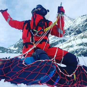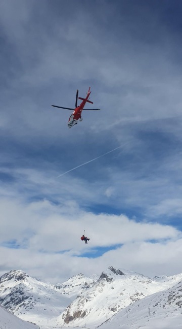 Najednou si začínám uvědomovat záda, nohu, a tak trochu i fakt, že ne pozítří, ale už určitě letos nepůjdu kitovat, Dole v údolí byla kite škola a zorvna byl i kurz. Honza není úplně lingvista, takže pomoc zavolal místní instruktor. Pavlovi, který mi jel mezitím pomoct, se podařilo podobné dílo s tím rozdílem, že mu zůstaly končetiny v obvyklých pozicích. Rychle balísvůj kite a po pás ve sněhu se pokouší dostat ke mě, aby sbalil i mého draka, aby tam mohl vrtulník. Zhruba po 40 minutách se ke mě v podvěsu dostává záchranář. Po ohledání mi zvedne náladu morfinovou dávkou , sbalí mě do sítě a za chvíli už se v podvěsu přesouvám na jezero.