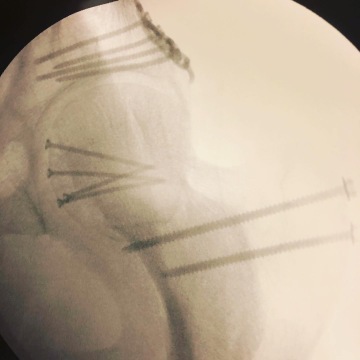 Operace trvá 5 hodin. Naštěstí jsem neměl žádné komplikace (krom těch kosmetických) , dostal jsem pár snímků se šrouby. Vnější úpravu dobře vidím sám. Druhý den chodítko, třetí den berle a chodit. Po týdnu od operace a po převozu do hradecké fakultky jsem zažil skutečné cestování v čase. Nejmodernější věcí místní chirurgie jsou patrně plastová okna, jinak prostředí, atmosféra i přístup personálu jak z černobílého filmu.