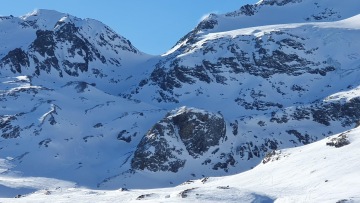 Druhý den se jevil maličko jinak, tak volba padla na Berninu. Standardní směr z údolí od St. Moritz nahoru, přašan už byl lehce povoleny a k poledni už na slunci začinal být trochu těžký snih. Foukalo opět velice málo, ale k s přibývajícím časem se to lepšilo. Ojezdil jsem spodní části, pár skoků pro turisty na jezeře a pak přišel Nápad dne. Pokusit se vydat do sedla Furcula dal Caral. Slabí vítr šel mírně z boku, takže jsem to bral tak, že maximálně, když spadne vítra, sbalím cajky a sjedu dolů na lyžích.
