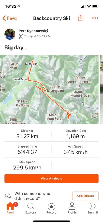 "Jeli jsme kitovat na Silvaplanu a do okolí Sv. Mořice. Podmínky měly být naprosto super. Už první den napadlo mraky nového sněhu, vítr byl sice slabší, ale jeli jsme na spot Bivio. Užil jsem si krásnýho prašánku i bombastický sjezd po uzavřené sjezdovce na kitu."