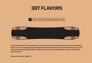 Zjednodušeně je 3BT prkno mezi vázáním stejné jako klasické camber prkno, ale nose a tail je od vázání rozdělen na 3 ploché části, kdy středová je pokračování klasického camberu a je určena na jízdu rovně. U Jib modelů je pak širší kvůli stabilitě na railech. Boční části se pak od vázání postupně zvedají v přesně vyměřeném úhlu, takže prkno neztrácí kontakt hrany v oblouku ale naopak do něj najíždí plynuleji. Nejzásadnější moment je konec efektivní hrany, tedy nejširší část prkna, která u klasického prkna stojí za jeho agresivitou a zasekáváním a právě tato část prkna, kterou k jizdě nepotřebujeme, se u 3BT prkna nedotýká povrchu a tedy pkno nerozhazuje a nebrzdi. Prkno tak jezdí plynuleji, rychleji, odpouští chyby a má větší pop. Zároveň konstrukce 3 plochých částí umožňuje klasickou údržbu prkna v servisech.