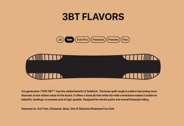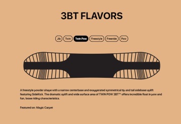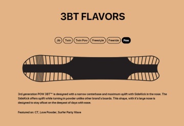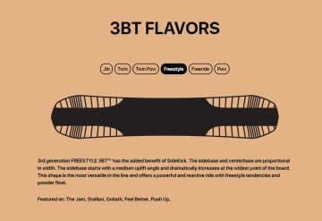 5. Sidekick? Sidekick! Tahle vlastnost je jedním z nejnovějších prvků 3BT prken, která ještě více zvyšuje odpouštění chyb. Jedná se o zrychlený odskok hrany, sidekick, v nejširším bodě nosu a tailu, tedy tam, kde skončí efektivní hrana. Eliminuje se tím agresivita prkna ať již při dopadech nebo třeba jen jízdě rovně. Sidekick také zvyšuje flow v prašanu a zlepšuje manipulaci s deskou v nerovném terénu.