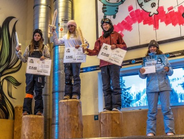 Každý měl dvě jízdy na to, aby předvedl to nejlepší. Závod doprovází sněžení a proto chybí rychlost. Ale každý se s tím vypořádal po svém. Já i Bohy vstupujeme do závodu bez tréninku. Máme jedinou možnost narvat - to tam hned z první. To se mi bohužel nevyplácí a z plánovaného backflipu z pole jamu málem dopadne double. V druhé jízdě se mi Backflip tacknie podařilo odjet, ale kapku jsem to přepálil a boj s rychlostí byl na místě. Taktak přejedu speedrail a úplně stejně dopadne i doubleking. Je z toho 14.místo, ale o to líp dopadli reprezentanti ze Špindlu. Vanesska bere v holčičí kategorii 7.místo a Dan v dětech 3.