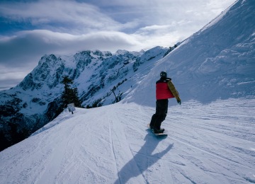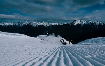 Hodně mrzlo, ale pár dní před naším příjezdem trochu sněžilo a resort si nechával sníh na levé straně resortu právě směrem k Mt. Shuksan, svítilo sluníčko a bylo tam 20 novýho, tak jsme si přivstali, abychom byli u toho ranního krájení. Do týhle lokality je potřeba vzít chair 5 – oproti ostatním je tahle část resortu víc easy a dokonce je tam pár urolbovaných sjezdovek (groomers), což ve freeride střediscích typu Baker, není moc zvykem. Prostě když není nakydáno, jsou to jen pořádný boule. No a pokud se člověk nechce vysílat tak moc a chce se trochu opřít o sjezdovku, může si v klidu jezdit chair 8, která ale bohužel nejezdila, protože toho sněhu bylo fakt bídně.
