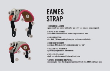 „V nabídce Switchback jsou dva sety kotníkových a nártových strapů. Eames Strap je víc tradiční, a to jak tvarem tak díky svému zpracování. Dodá ti velkou oporu a má skvělou responzivitu. Miller Strap je vyrobený vstřikováním nylonového materiálu a jeho kompozice je víc pružnější, bez míst, kde by tě mohl tlačit. Oba sety jsou skvěle nedesignované a maximálně pohodlné. Doplňují je tvarované ozubené pásky, které v kombinaci s hliníkovými ráčnami fungují v jakékoli situaci.“