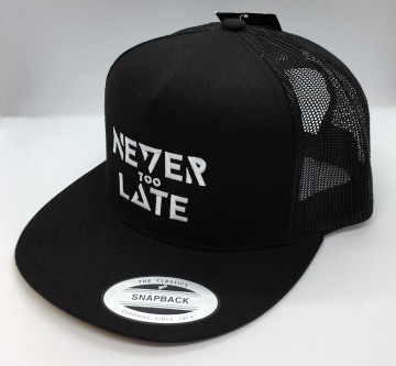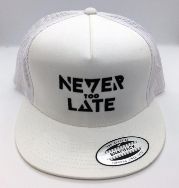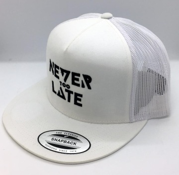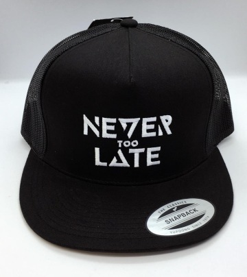 Zbývá nám pár posledních kousků truckerek (síťovek), a to v černé a bílé barvě, vždy s výšivkou NEVER TOO LATE přes celé čelo. Cena je 450Kč.
