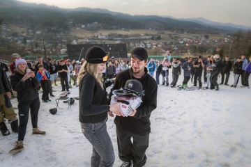Jelikož jsme podle mě dobří lidé, co se organizací těchto mecheche týče, tak se rozhodlo, že se vybere "Best babenka", stejně tak "Best youngblood freeski + snowboarder" a samozřejmě 3 nejlepší freeski a stejný počet snowboarders. Účastníků se snowboardy bylo více a tak dostali větší prize money, jelikož to prostě bylo fér a to my máme rádi. Za babenki ( východní slang pro ženy, dámičky, dívky ) jezdila během dne jedna jediná a to "Madlenka", která kromě hlídání dětí během celého dne stihla naložit i bednám ve snowparku a kromě velkého obdivu všech příchozích si odnesla domů třeba krásnou snowboardovou bundu Vans za 50/50, bořka a noseslide. Nejlepším mladým freeski byl porotou vybrán střelec Tobias a stejně jako snowboardová youngblood Lukáš "mladý Šíma" Šimíček, který se během dne přemístil z beden až na největší platformu, kde šlo vidět, jak ho celý den a přítomnost všech kolem a kolem posouvá dále, pobrali ceny od sponzorů, hrdost super rodičů, rozdali úsměvy a to nás baví nejvíce.