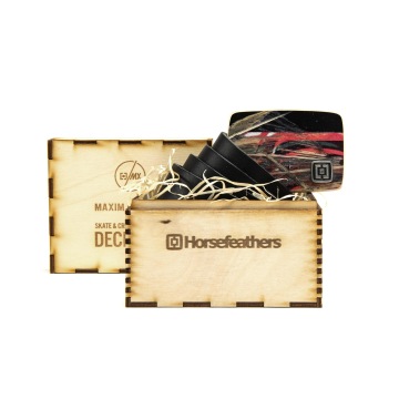Unikátní Horsefeathers pásek Deck Belt je postaven na tradici DIY a recyklaci desek Horsefeathers team riderů. Jeho historie sahá až do roku 2011, kdy byl poprvé představen na veletrhu ISPO a získal několik ocenění. Hrdými majiteli Deck Beltu je spousta známých jmen jako například americká skate legenda Tony Magnusson nebo CEO Osiris shoes Tony Chen. V charitativní online aukci se díky Deck Beltu vybralo 860 Euro na projekt Skateistan. Desky do této aukce byly vyrobeny ze zlomených desek ježděných v Kábulu v Afganistánu.