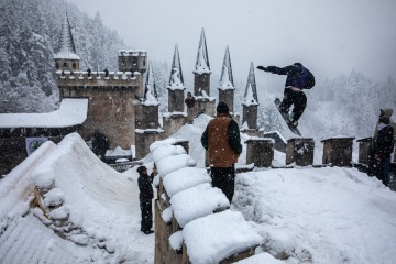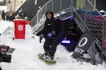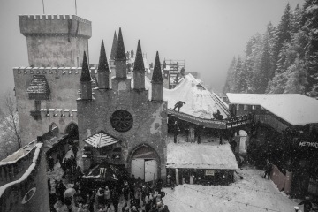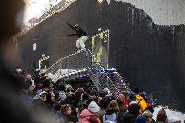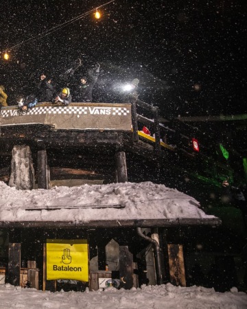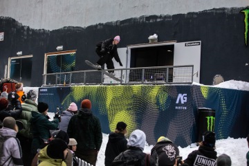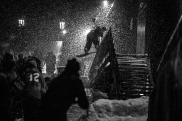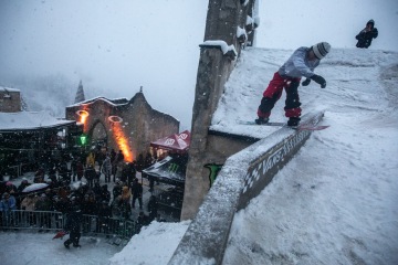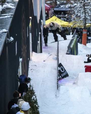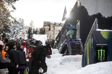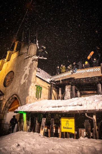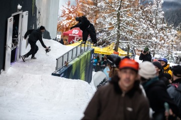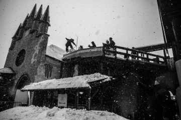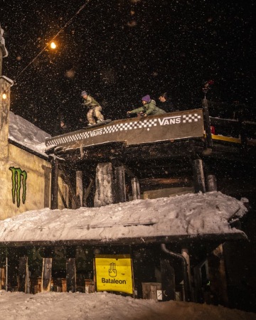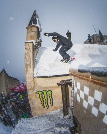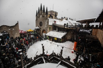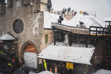 Atmosféru podtrhovalo nepřestávající sněžení, žízeň průběžně zažehnávalo pivko z našeho stánku a hecovačky všech riderů se stupňovaly. Full send dne patřil Ethanovi, který hradbu Seefeldského hradu dropl z vrchu až dolů bez mezilandingu na střeše.