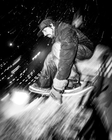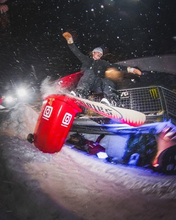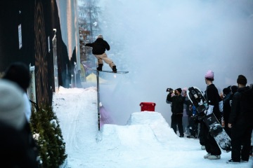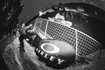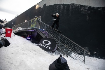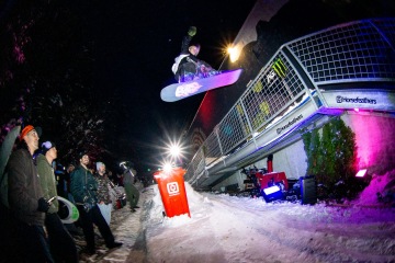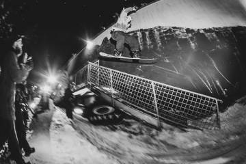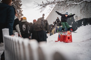 Rideři měli k dispozici streetový setup, který sestával ze zábradlí, schodů a divácky přitažlivého wallridu. To byl Fabiho šálek kávy, takže to tam neúnavně točil kolem dokola. No a co by to bylo za snowboardovou akci, kdyby se tam něco nebongovalo?! Tentokrát to schytala naše červená popelnice, která od riderů definitivně dostávala "co proto". Kreativní sérky se jezdily až do večera, kdy seto celé pomalu a plynule začalo překlánět do finální afterparty.