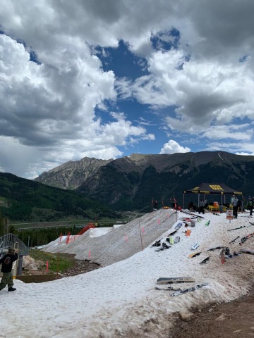 Trénink začínal v 8:30, kdy parta nastoupila do autobusů, které všechny vyvezly do parku uprostřed zelené sjezdovky. Z ničeho nic se objevila obrovská masa sněhu, na které byl postavený mega park s pojízdným pásem, aby se nemuselo šlapat. Park vypadal následovně: začínal skoky, pak následoval wallride, dva cornery, radius, skok do bagu, raily ( C – čko, 22ft, rainbow, lámačka, double rail), dále trubky ( Z-ko, double king, lámačka), bedny a samozřejmě nesmělo chybět lízátko.