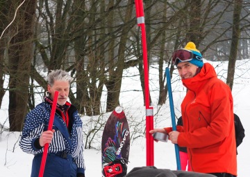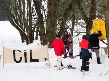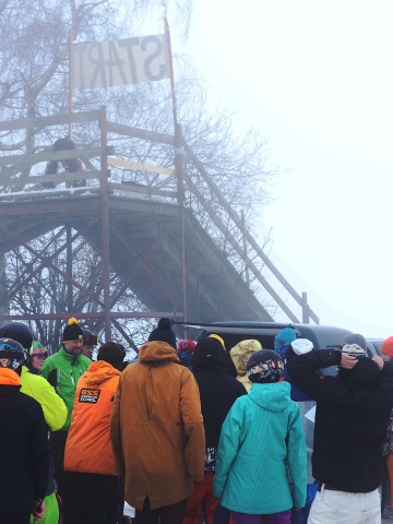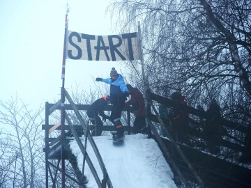 Velký nápis START je napsaný lepící páskou na bílém ubrusu napnutý pomocí dřevíček „co dům dal“. Rozjezdový můstek pod náporem sněhu a čekajících vlčáků a vlčic tiše kvílí. Celé to připomíná dobu, kdy několik přítomných pionýrů tento sport teprve objevovalo, prostě paráda. Několik nadšenců v čele se Zobákem dokonce dobový outfit navlékli a nedivil bych se, kdyby příští ročník těhlech vypásnutejch overálků spatřil více.