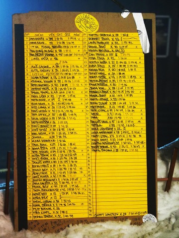 Velký nápis START je napsaný lepící páskou na bílém ubrusu napnutý pomocí dřevíček „co dům dal“. Celé to připomíná dobu, kdy několik přítomných pionýrů tento sport teprve objevovalo, prostě paráda.