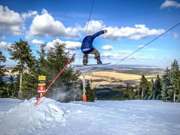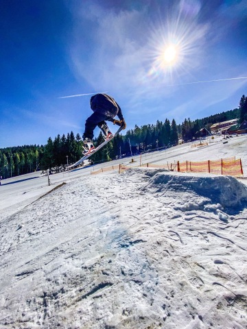 A to rozhodně nebylo vše. Jelikož se v parku zatáhlo, tak jsme to zabalili a šli za sluníčkem. Auty jsme se vyvezli nahoru na Klínovec a šli na horní část Zabitého, kde Moran našel tyčku a hned byl na světě spot. Vytvořili jsme takový pole jam. Dopad byl sice trošku na placku, ale překážka to byla příjemná. A jelikož to byl opravdu kvalitní spot, tak z něj vzešlo spoustu krásných fotografií.