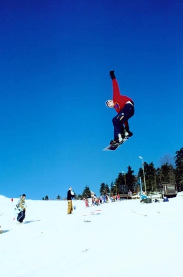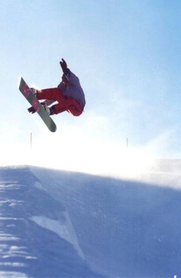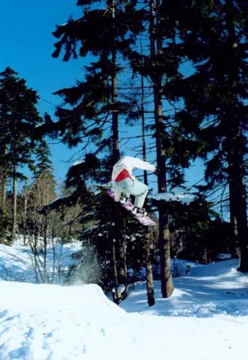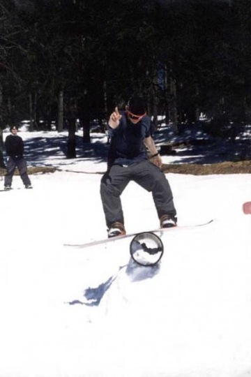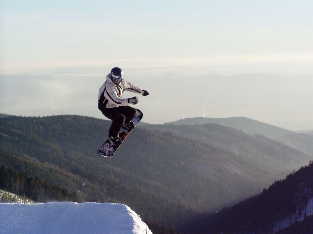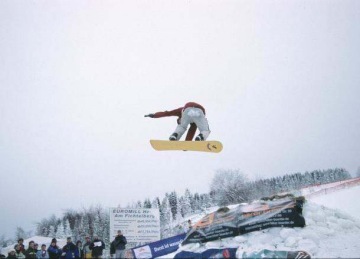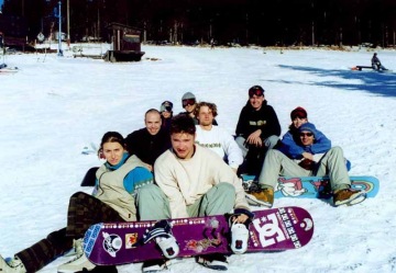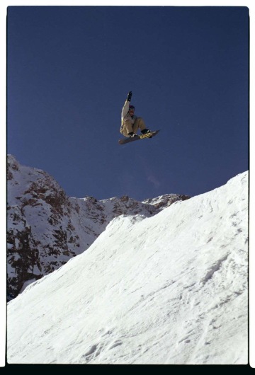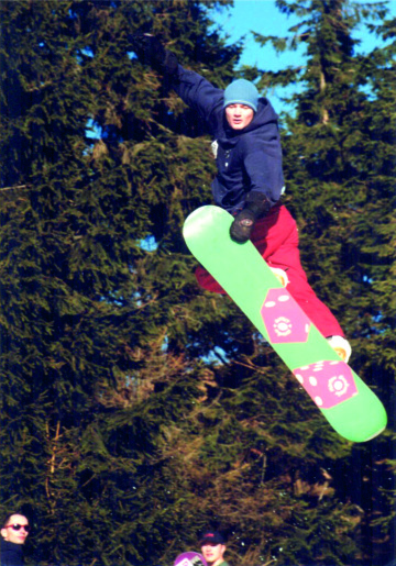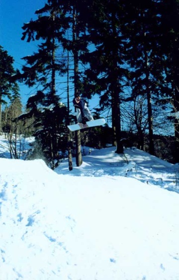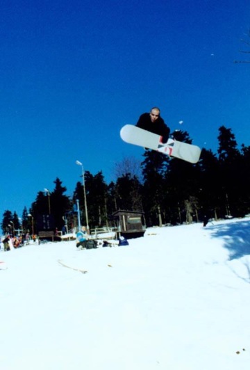 Jenže do toho přišla revoluce. Najednou se dalo všechno bez problémů sehnat, a tak jsem si v roce 1992 koupil svoje první originál prkno, v té době velmi populární značky F2 s tvrdým vázáním zapínaným do lyžařských přezkáčů. Rychle jsem zjistil, že to je slepá cesta, a zákonitě přešel na freestylové prkno s měkkým vázáním. A když freestyle, pak samozřejmě nějaké ty polety. Začal jsem si plácat první můstky, ovšem nikdo nevěděl, jak mají pořádně vypadat, a tudíž to byl neustálý pokus–omyl. U lyžařů byla tehdy velmi populární „rokle“ – z dnešního pohledu totální harakiri, ale měla už trochu parametry a dalo se z ní slušně proletět. Z téhle doby bych chtěl připomenout i tehdejší spoluprůkopníky, jako byli Mára Rolenc, Honza Kašpar, Vlasta Borovička, kluci z Ostrova v čele s Davidem Strossem a pak samozřejmě Chebáci s legendou Honzou Meindlschmidem alias Majďákem.