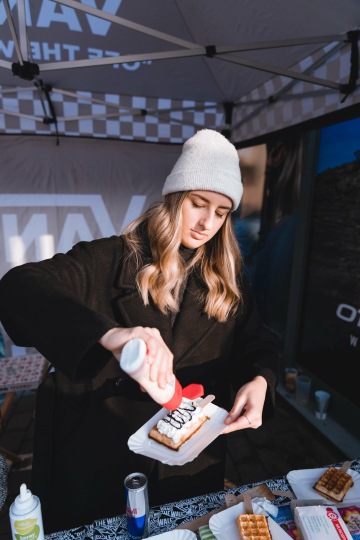 Akce začínala ve 13 hodin, takže hned po obídku čekala sladká tečka v podobě Vansových vaflí a k tomu nesměla chybět ani italská káva od kluků z Biograf Cafe. Pro ty, kteří na to sladké moc nejsou, bylo k dispozici vychlazené pivečko Horsefeathers či Redbull. Zkrátka hlady a žízní tu nikdo neumřel.