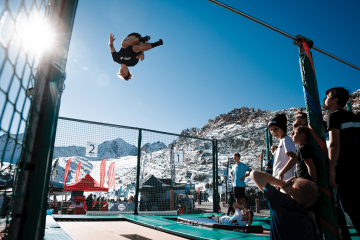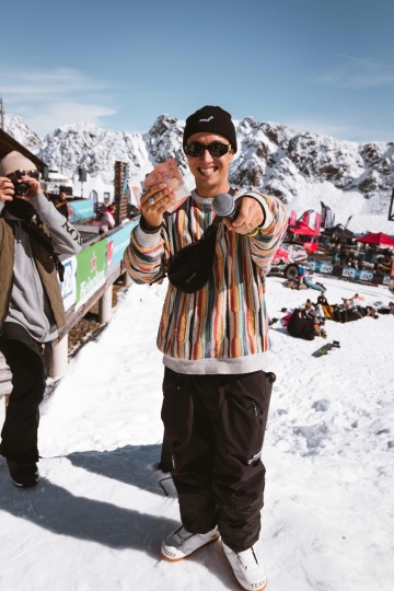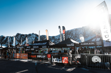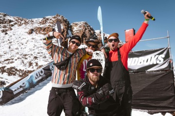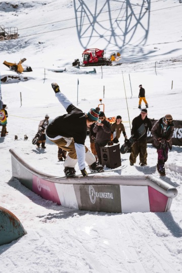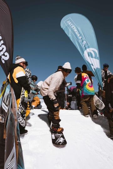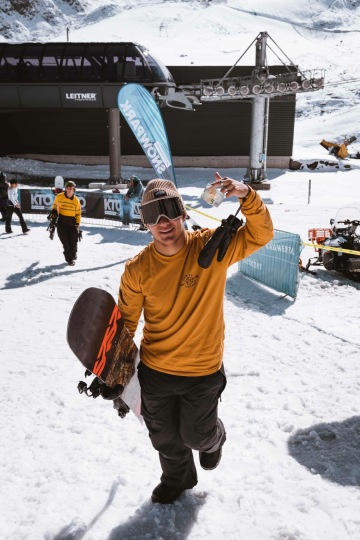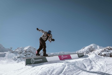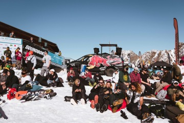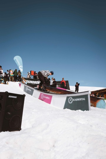 Kaunertal hned při příjezdu panoval skvělou a uvolněnou atmosférou. Testovací vesnička byla plná brandů nabízejících na vyzkoušení nejnovější modely bot, brýlí, vázání a snowboardů. Hned vedle lanovky stál už klasicky připravený setup na jibb contesty a zaparkovaný RedBull Saurus neúnavně vyhrával celý víkend.
