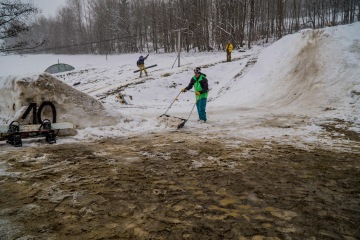 "Fajn, desítka bude s mezinárodní účastí, musím aspoň nějakej náznak trati vybojovat”, řikal jsem si a šel se podívat jak to venku po deštích dopadlo. Sněhu zbylo jenom trochu pod barákem a na platformách smutně stály samotný odrazy skoků. Situace nepopsatelná bez použití nejsprostších nadávek. Strategie přípravy byla teda jasná: navozit co nejvíc sněhu na hromadu, přikrejt ho plachtou a den před závodama všechno frézou přeflusat tak, aby bylo možný skákat aspoň jeden skok. Následující dva dny jsme se Šimonem (díky) odvozili milion koleček, Viktor nám pak pomohl ještě naložit pár vozejků, do toho neustále lilo v proudech, louky v okolí se zelenaly..... jediný co nám dodávalo trochu sil, byla předpověď, ve který na sobotu slibovali sněžení.