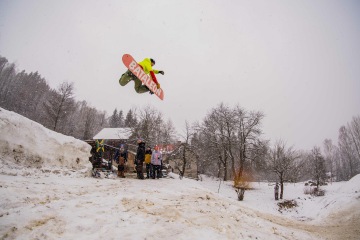 V sobotu ráno napadlo akorát tolik, abychom mohli zprovoznit vlek a aby se dalo rozjet na druhej skok. Paráda! Dost se mi tím ulevilo a rád bych ještě jednou poděkoval všem riders co dorazili a bez bázně se hned chopili lopat a pomohli trať upravit do jezditelný podoby. Pak už to šlo jako po másle (bahně), riders office se otevřela, rychle jsem vymyslel nějaký pravidla a začala session. Letos se jelo na 4 triky s tím, že kdo zapsal čtyři 180, 360, 540........mohl přidat ještě 5. bodovanej trik. Opět si každej sám rozhodnul, jestli trik odjel a jestli ho provedl stylově, protože porota na mým závodě (zatím) žádná není.....