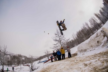 Desítka je totiž číslo, který zdobilo letošní Backyard JAM. Tohle významný jubileum jsem měl v plánu oslavit hardcore tratí, kde by se skákalo z pergoly do dopadu druhýho kickeru a pak rovnou přes vlek někam do údolí. Termín jsem zvolil schválně už na 25. února, protože do baráku měl zrovna dorazit Drake team a zároveň jsem počítal s tím, že tou dobou bude dostatek sněhu. Ještě 18. to byla pravda, ve snowparku leželo půl metru, ale přes tejden se oteplilo, začalo lejt a několikadenní průtrž mračen postupně všechen sníh odplavila dolu do Jizery. V úterý jsem volal Alexovi (manager Drake), aby nejezdili, že je tu zelená louka a bahno.....odpověděl, že to je fuk, že stejně jedou a že určitě něco natočej a vymyslej.
