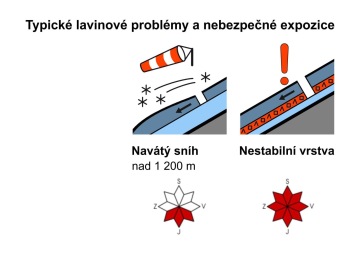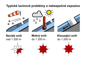 západní a poslední tři dny vál silný severní nárazový vítr. Větrem přemístěný sníh se ukládal na závětrných svazích JV, J, JZ, žlabech a v odtrhových zónách.