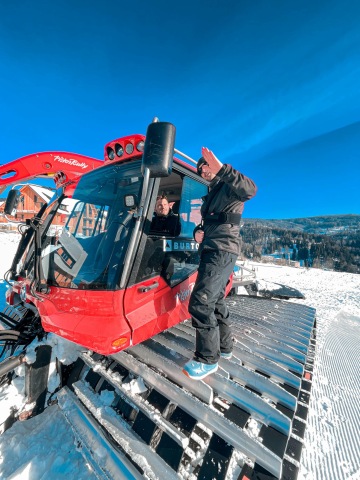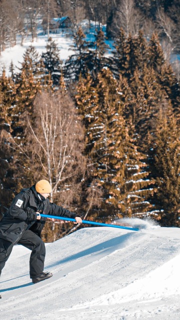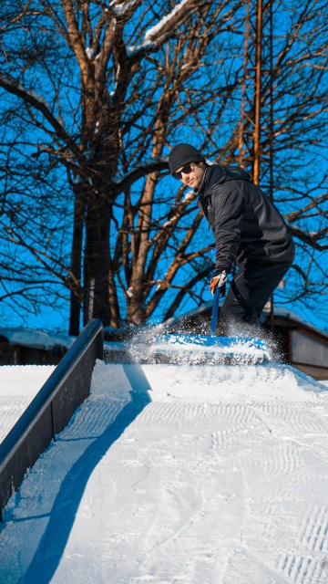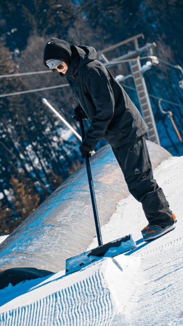Klasický den vypadá tak, že se ráno sejdeme s klukama, projdeme si park a vyladíme odrazy, když je mlha stříkáme hrany skoků a jdem na snídani. Většinou Jeepr udělá míchaný vajíčka a pak se jde stavět nebo jezdit. Během dne děláme 1-3 reshape podle toho jak moc je to zničený. Když se vypne vlek, tak začíná večerní shaping, kdy se snažíme vše dát do původního stavu, aby nám to přes noc zatuhlo v nejlepším možným tvaru. Pak už jen doufáme, že nám to přes noc nerozjezdí a nerozdupou děti a sáňkaři, což se děje jednou týdně minimálně :D.