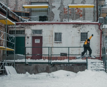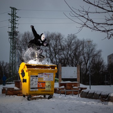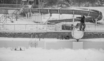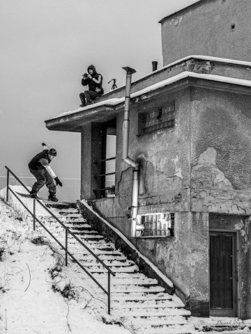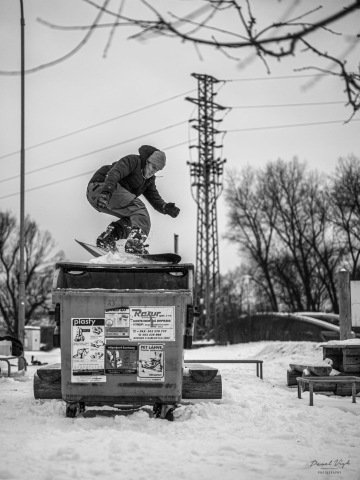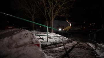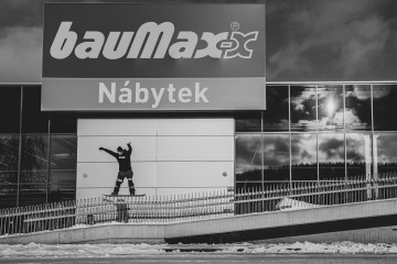 O tomhle spotu se bavíme už dlouho, ale nikdy nebylo dost sněhu, proto to byla jasná volba. Sešlo se nás fakt dost, párkrát se hodilo lopatou a spot byl ready na first try. Ve chvíli kdy se Štěpán rozjel, vyběhla z Baumaxu vrchní směny a stoupla si na dopad railu. Blekotala něco o tom, že si to nemůže vzít na triko a musí se zeptat šéfa. Než přišla zpět, zvládli jsme každej 2 pokusy a rychle pryč, protože volala policajty.