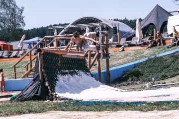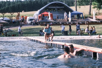 Areál, kde najdeš vše na co si vzpomeneš. Koupaliště s příjemně studenou přírodní vodou a obří skluzavkou. Na břehu koupaliště je pláž s bílým pískem, jak na Zanzibaru. Na této pláži se dá jezdit na skimboardech a přes koupaliště je natáhnuta slacklina. Všude okolo jsou místa na chill, ať už na příjemném anglickém trávníku nebo pod slunečníky. V areálu najdeš i parádní servis od vyvoněných záchodků se sprchami, chatek, ohniště, grilu, baru s jídlem, pivem a chlastem, obřího podia pro kapely, multifunkčního hřiště, pumptracku, minošky a hlavně rampy pro řádnou letní jibbovačku.