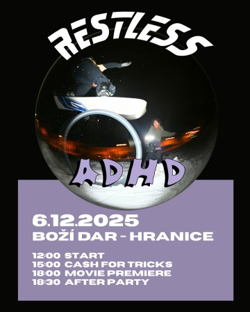 Restless Snowboarding tě zve na jibbovou akci na Božím Daru, kterou zakončí druhou zastávkou premiéry jejich nejnovějšího videa ADHD. Pojď se mrknout co tě v sobotu 6. prosince na místě čeká.